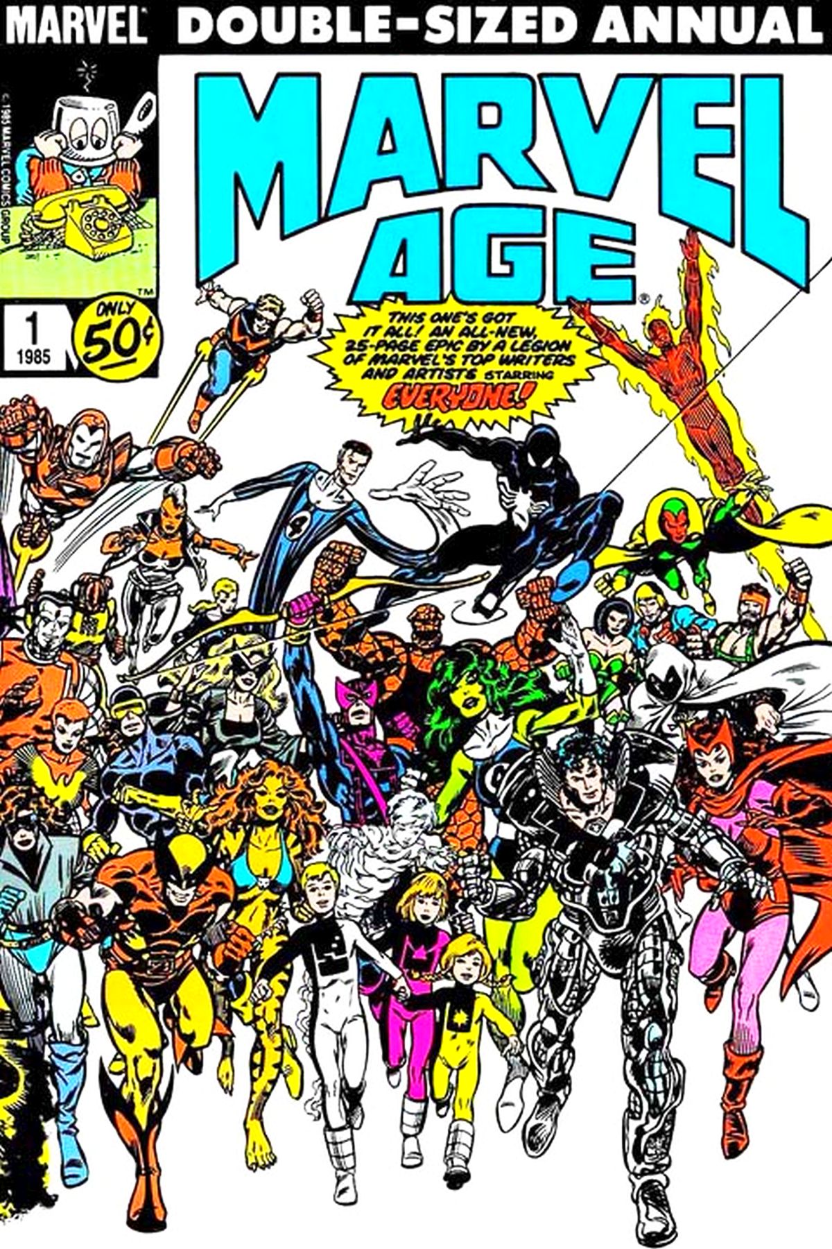 Full 25 page story by Marvel's top artists and writers guest starring just about everyone in the Marvel Universe. Kurt Busiek, Jim Shooter, Jo Duffy, Roger Stern, Sal Buscema, Walt Simonson, Mike Mignola, plus many others. Concept by Jim Shooter; opening page by Kurt Busiek, James Fry and Keith Williams; Secret Wars II page by Jim Shooter, Al Milgrom and Steve Leialoha; Uncanny X-Men page by Jo Duffy, Ron Frenz and Dan Green; New Mutants page by Jo Duffy and Steve Leialoha; Doctor Strange page by Roger Stern and Sal Buscema; Alpha Flight page by Bill Mantlo, Mike Mignola and Gerry Talaoc; Mighty Thor page by Walt Simonson; Amazing Spider-Man page by Tom DeFalco, Ron Frenz and Joe Rubinstein; Squadron Supreme page by Mark Gruenwald, Bob Hall and John Beatty; Avengers page by Roger Stern, Kerry Gammill and Tom Palmer; West Coast Avengers page by Steve Englehart, Al Milgrom and Joe Sinnott; Devil Dinosaur page by Kurt Busiek, Richard Howell and Andy Mushynsky; Daredevil page by Denny O'Neil and David Mazzuchelli; Cloak and Dagger page by Bill Mantlo, Rick Leonardi and Terry Austin; Moon Knight page by Alan Zelenetz and Chris Warner; Fantastic Four page by John Byrne and Jerry Ordway; The Vision and the Scarlet Witch page by Steve Englehart, Richard Howell and Andy Mushynsky; Invincible Iron Man page by Denny O'Neil, Mark Bright, Ian Akin and Brian Garvey; Captain America page by Mark Gruenwald and Paul Neary; Power Pack page by Louise Simonson, June Brigman and Bob Wiacek; The Eternals page by Peter Gillis, Sal Buscema and Al Gordon; Incredible Hulk page by John Byrne and Bob Wiacek; the Marvel Bullpen 3-page final sequence by Kurt Busiek, James Fry and Keith Williams. Wraparound cover by Kerry Gammill and Tom Morgan. Cover price $0.50. |