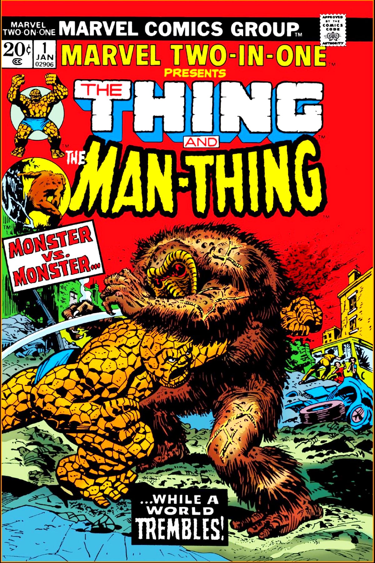 The Thing, still trying to get home, sees a magazine cover featuring the Man-Thing in a small town Bus Station. Upset by the similarity of his and Man-Thing's names, he decides to travel to Florida instead of New York. The Molecule Man, confined to his other-dimensional prison, tells his son to avenge him by destroying the Fantastic Four, and then apparently dies. The construct then undergoes a process similar to that which gave Molecule Man his powers. He attempts to teleport to New York City, but instead appears in the Florida Everglades, face to face with the Man-Thing. The Thing arrives and is surprised to see the Molecule Man. He charges the villain, but the Molecule Man uses his wand to transform both the Thing and the Man-Thing back into their human forms. The two men are believed to be human again, but realize that they must still stop the Molecule Man before he fulfils his vow to destroy the entire Fantastic Four. By the time they catch up to him, the Molecule Man has reached the nearby town of Citrusville and is wreaking havoc with the powers of his wand. He even turns an innocent pedestrian into a likeness of Mister Fantastic and kills him. The Molecule Man notices that Ben Grimm and Ted Sallis seem more compassionate and driven to stop him in their human form than in their more monstrous forms, so he transforms them back to the way they were before. It is his wish see the two destroy each other. The Thing punches his fist through the Man-Thing's body and withdraws a fistful of muck. He hurls the slime at the Molecule Man, striking his wand. The cosmic device flies from his hand and rolls through some cracks in the wreckage. As the wand is the reservoir for his power, the Molecule Man desperately tries to retrieve it. His power levels are quickly depleted his life essence drains away. After the construct dies, the Thing recovers the Molecule Man's wand, while the Man-Thing instinctively begins lumbering back to his swamp. The Thing hands the now-powerless device to a nearby child.