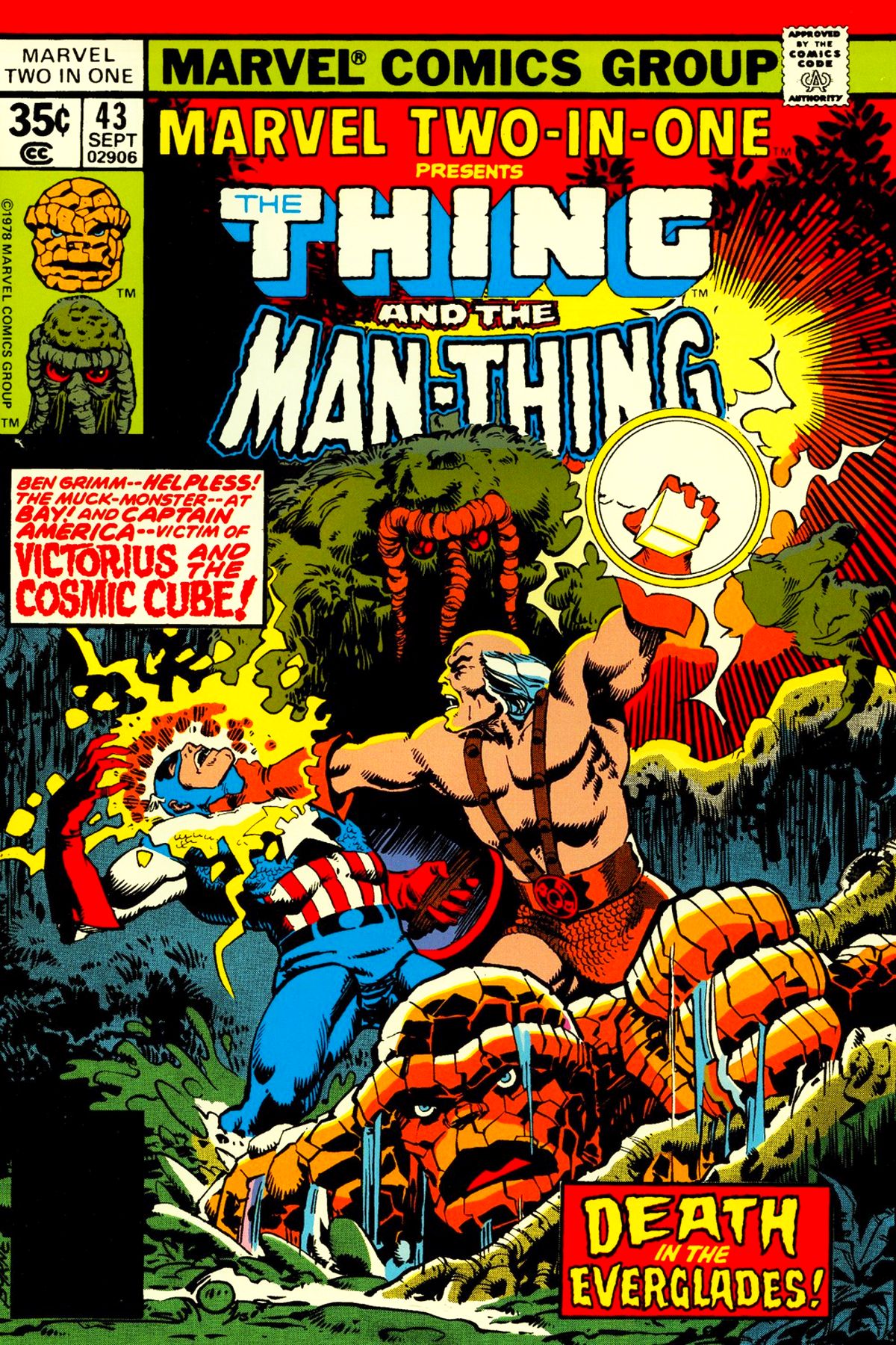 Captain America and the Thing follow Victorious to the swamps in hopes of recovering the Cosmic Cube. Victorious has created Jude, the Entropic Man, and hopes to compel him to destroy all life in the Universe. |