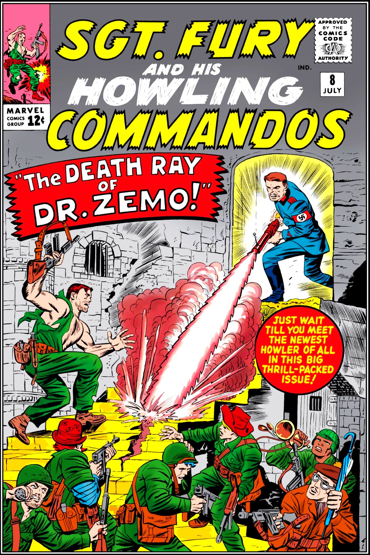Fury's unit has a new member, Percival Pinkerton, assigned to replace Junior (who died in issue 4.) The group heads out after Dr. Heinrich Zemo, a Nazi scientist who has created a very powerful death ray. The odds are stacked against them, even if they do make it all the way to Zemo's booby-trapped castle. |