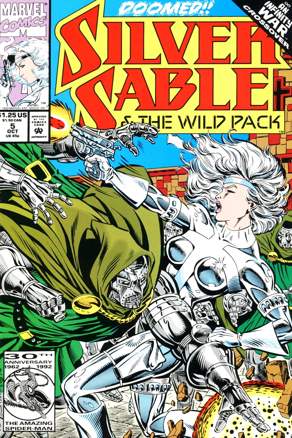 Silver Sable's state dinner with Dr. Dom turns out to be a ruse, instead of dinner, she finds herself fighting against the Doom doppelganger and all the doombots! |