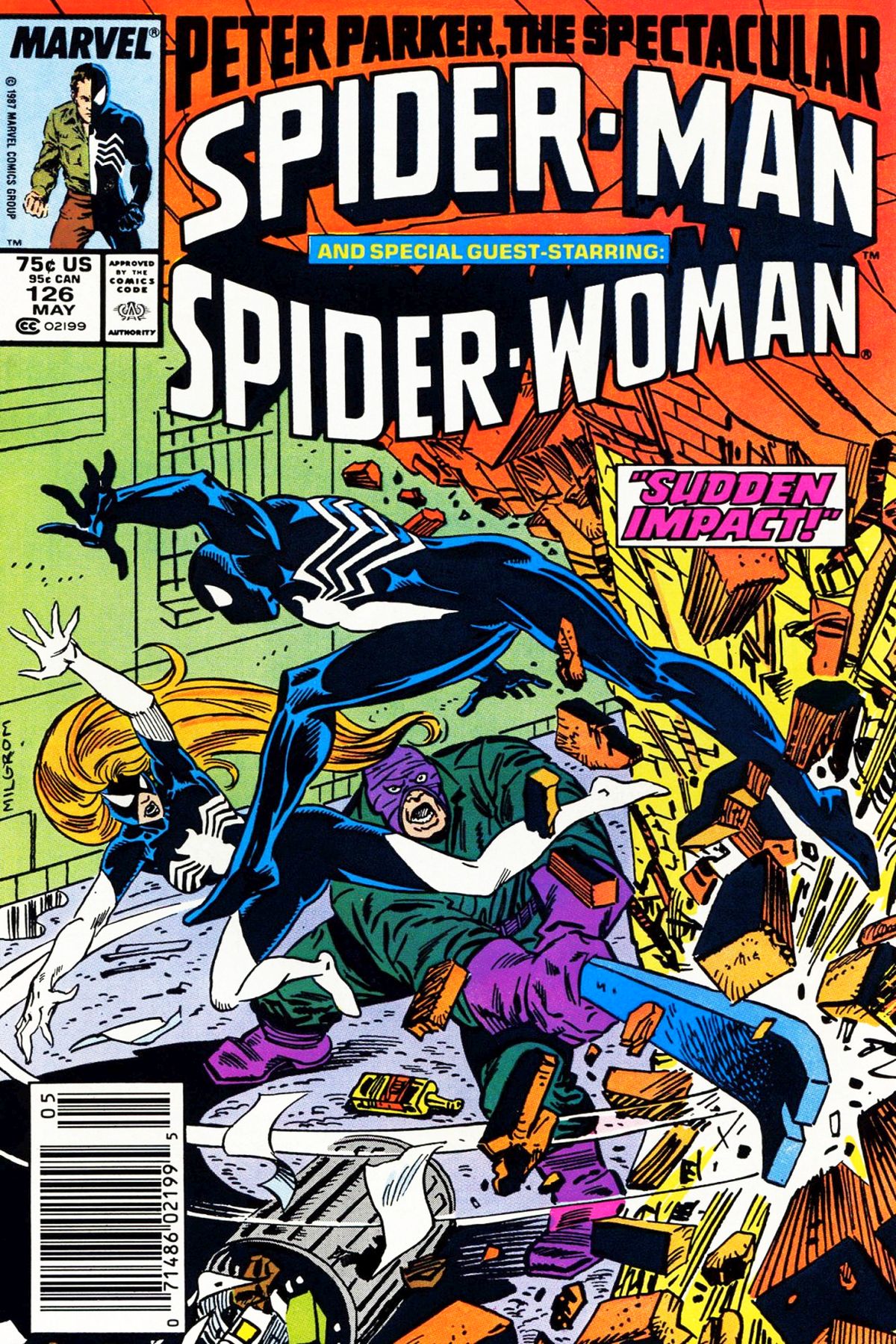 While trying to get photos of the new Spider-Woman, Spider-Man finds himself between the masked heroine and the Wrecker. Having just destroyed the disc that Spider-Woman was seeking to obtain, the Wrecker now vows to kill them both. The two arachnid heroes are on the defensive until Spider-Woman manages to grab the Wrecker's crowbar. However, when she tries to use it against him, she discovers that he cannot be harmed by its magic. Spider-Man swings in and rescues Spider-Woman before she can be harmed and they both flee. Spider-Man manages to tag the Wrecker with a spider-tracer on the way. They stop to rest at the New York City Transit Authority. Meanwhile, the Wrecker thinks about how his plan is falling apart. He recalls how he was given his powers from the Norn Queen years earlier. He thinks about how he was regularly defeated by Thor until he divided his powers up among the members of the Wrecking Crew. However, Thor recently stripped the rest of the Wrecking Crew of their power, transferring it all back to him. The Wrecker then begins to wonder what to do next as he has not worked solo for some time. He also finds himself conflicted, thinking of his ill mother. He wants her to be proud of him before she dies, but can't bring himself to go straight. At that same moment, Dirk's mother is watching the news coverage of her son battling Spider-Man and Spider-Woman. She is aware of her son's criminal career and blames herself. She raised Dirk alone after her husband died, and he fell into a bad crowd. She looks at a letter she received with a large sum of money in it.She knows it came from her son, but refuses to use any of the money he has sent to her from the crimes he has committed. All she wants is for her son to go straight before she dies. A few hour later, both Spider-Man and Spider-Woman are in an out of business diner. There, Spider-Woman calls Michael Clements who is unhappy that the disc he hired her to obtained was destroyed. However, he secretly gloats that this failure will keep Spider-Woman under his service a longer. He then calls his daughter to check on how she is doing. Meanwhile, Spider-Man has been trying to get ahold of the Avengers and the Fantastic Four, only to discover that both teams are out of town.[Continuity 4] With nobody else in the city who can stop the Wrecker, Spider-Man tells Spider-Woman that it is up to them. That's when Spider-Man tells her that he tagged the Wrecker with a spider-tracer. Spider-Woman refuses to go, as she has to meet with Clemson's helicopter otherwise she will not be able to see her daughter. Spider-Man can't shirk his responsibility and decides to go after the Wrecker, with or without her. Meanwhile, the Wrecker has arrived at the Tombs Prison to free the rest of the Wrecking Crew. He easily trounces the guards and frees his comrades and they escape. This plays right into Thunderball's hands as he intends to steal the Wrecker's power for himself. When Spider-Man arrives, he is too late to stop the breakout but learns that the villains escaped through the utility tunnels. At that moment, Spider-Woman recovers her handbag from the roof and spots a notebook that the Wrecker dropped during their battle. Hearing Dirk's mother calls out for him from the house across the street, Spider-Woman's maternal instincts draw her there. She explains that she is also a mother and asks for advice on what she should do. Anne Garthwaite tells Spider-Woman to do the right thing, for her daughter. Recalling how Spider-Woman recently fought her son, she tells the masked heroine to give a note to him for her and then dies. As the ETM's deal with Anne's body, Spider-Woman takes the letter and leaves. At that moment, at one of Baron Zemo's secret safe houses, the Wrecker and his teammates recoupe from the escape. Thunderball figures that with the sophisticated computers on hand he can recreate the design for the bomb on the disc that was destroyed. The Wrecker likes the sound of that and intends to retire after they make one last big score. However, Thunderball is not sold, pointing out that the Wrecker loves this life too much to give it up. When Piledriver and Bulldozer ask when the Wrecker is going to divide up his powers again, their leader isn't sure he can. That's when Thunderball tells him to help with some heavy lifting. While the Wrecker's back is turned, Thunderball takes two live wires and presses them against the Wrecker's temple. He is willing to kill the Wrecker to get his power back, but they are interrupted by the arrival of Spider-Man. The Wrecker and Thunderball agree to put their differences aside to kill the wall-crawler. When Spider-Man sees the live wires he thinks how he used electricity to stop Thunderball in the past and tries to get them. However, Thunderball manages to incapacitate Spider-Man with the wires. He then attacks the Wrecker, who is still weakened by the electrical jolt he received earlier. Thunderball manages to wrest the Wrecker's crowbar from his hands, claiming his powers. Before Thunderball can use his newly gained power, Spider-Woman arrives and tries to keep him back with a psi-web. However, he manages to break loose, but buy this time, Spider-Man has recovered and attacks again. This distracts Thunderball long enough for the Wrecker to get close enough to try and wrestle the crowbar from his hands. Pulling his crowbar free, the Wrecker decides to let Spider-Man and Spider-Woman go as they helped him regain his powers. However, Spider-Man refuses to stand down and resumes his attack. He easily overpowers Spider-Man, but before he can kill the wall-crawler, Spider-Woman hansd him the note from his mother. Dirk is shocked to find all the money orders he sent his mother inside, uncashed. Reading the letter, his mother's final words were telling Dirk to go straight as there is a good person inside him somewhere. Telling the Wrecker that his mother died moments earlier, the Wrecker lashes out, blaming the authoritie