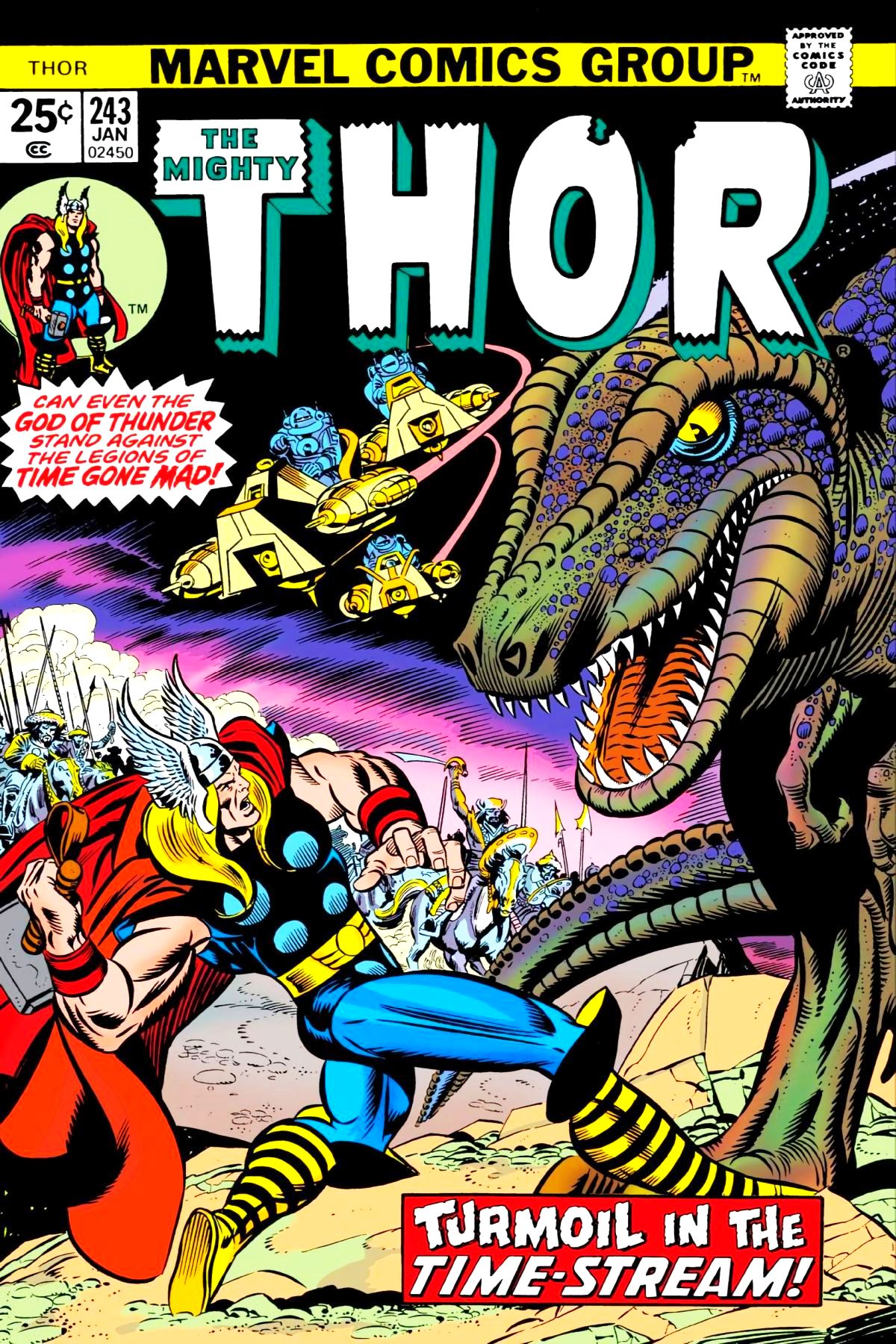 Zarrko tells Thor and the Asgardians about the Time Twisters, beings traveling back through time from the 80th Century. And every time they appear on Earth, it is destroyed. They agree to go with Zarrko, but once in the time stream, they are assaulted by dinosaurs, Mongol warriors, and soldiers from the future. |