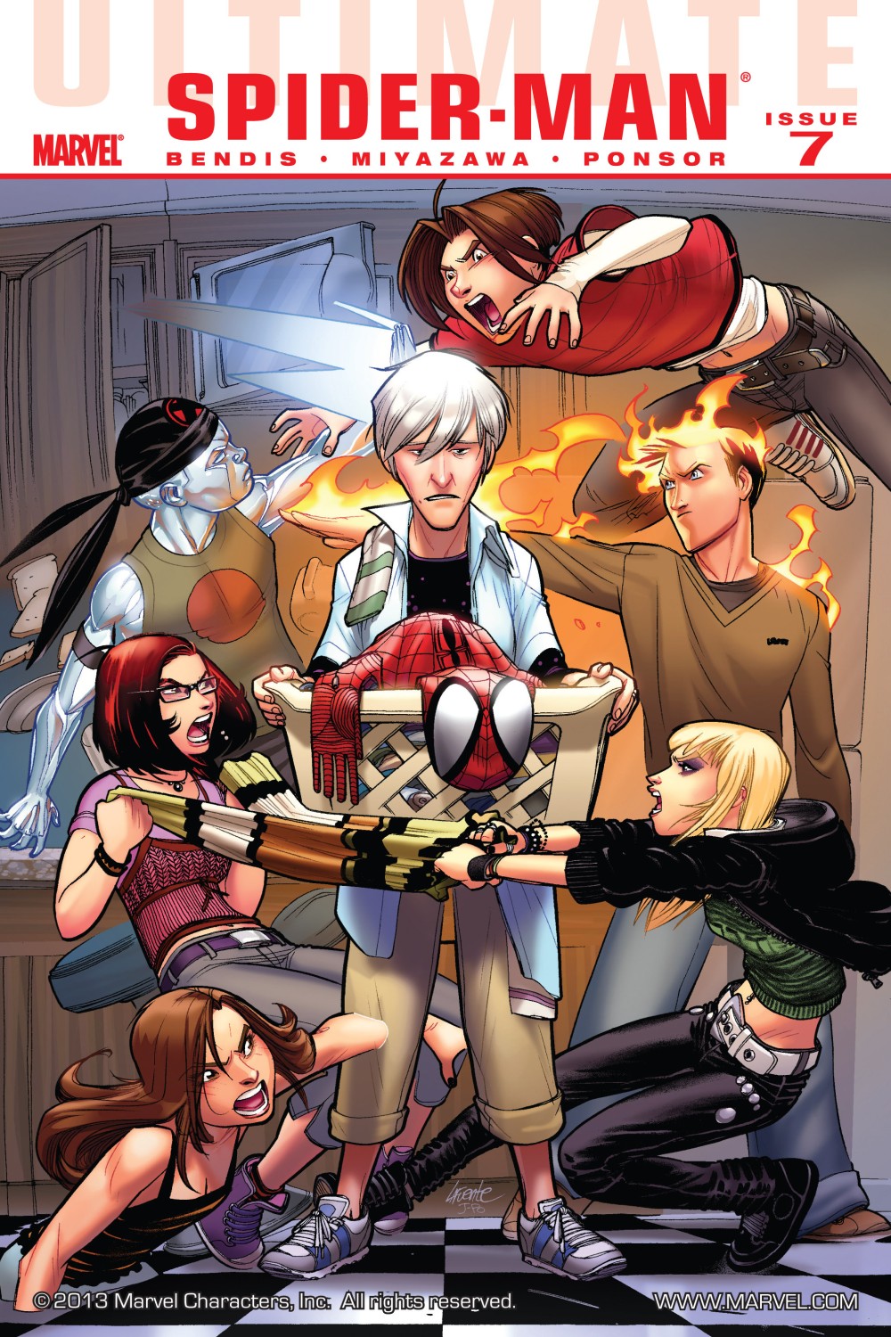 Several months ago, Rick Jones suddenly was given powers. (See "Ultimate Origins" for details.) The transformation left him in a coma, and when he awoke he returned home, just a few homes away from Spider-Man. Peter, Johnny and Bobby pay him a visit to help him acclimate to his new abilities, but they tend to surprise him more than anything. |