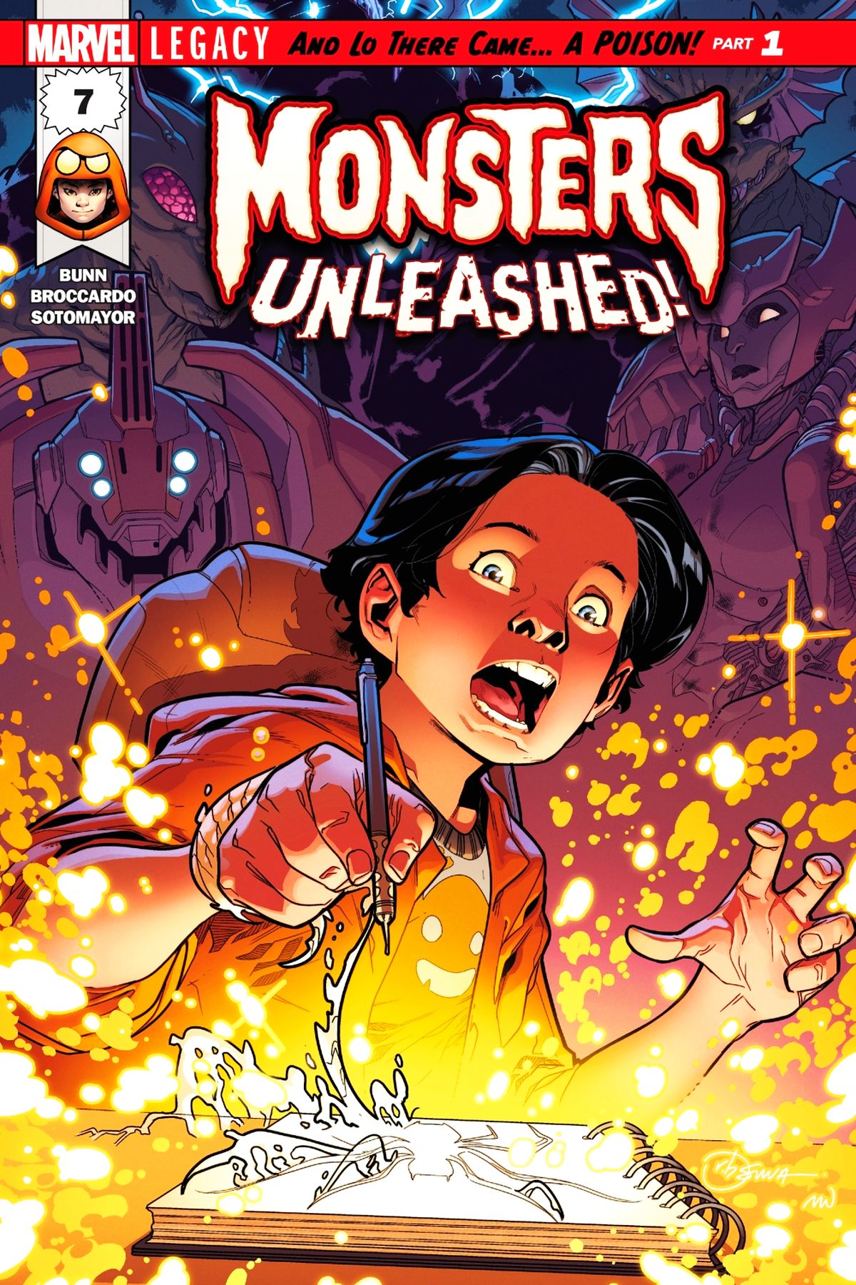 AND LO THERE CAME...A POISON! Part 1 In a secluded realm hidden amongst the snowy fissures of Antarctica, a dangerous world that time as forgotten continues to thrive -- one where beastly giants of colossal size still roam the Earth and where the lines of man and monster blur. Enter Marvel's newest hero, KID KAIJU, with the power to summon an all-new team of monstrous Marvel heroes - AEGIS, SLIZZIK, SCRAGG, HI-VO and MEKARA. But in a world already controlled by fiendish beasts, can KID KAIJU call an army powerful enough to protect the boarders of the Savage Land that threatens the very safety of the entire planet? PLUS: Includes 3 bonus MARVEL PRIMER PAGES! Story by Robbie Thompson and a TBA artist! Rated T