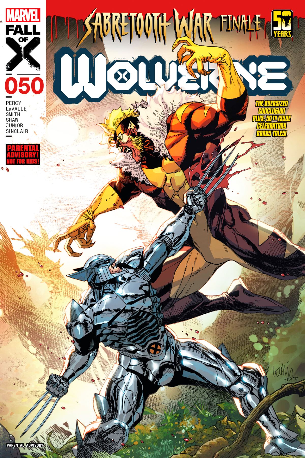 CREED VS. LOGAN - THE FINAL SHOWDOWN! It's all come down to this: the final battle between WOLVERINE and SABRETOOTH. The Sabretooth War concludes in the way it began - a violent, bloody battle - but WHO will be left standing? Plus: Special short stories celebrating fifty issues of this run and 50 YEARS OF WOLVERINE, from legendary Logan scribes including Larry Hama, as well as a final send-off from Benjamin Percy and Javi Fernández, and some special SURPRISES! Rated T+