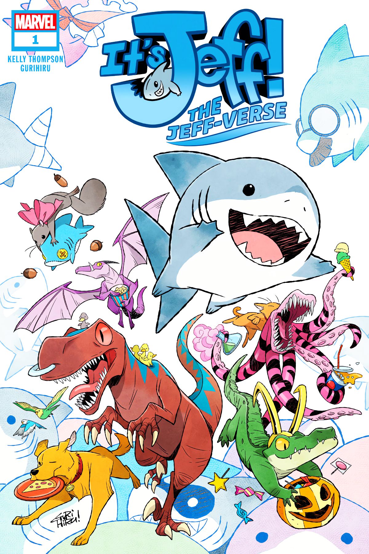THE DANGEROUSLY ADORABLE JEFF THE LAND SHARK RETURNS! Jeff the Land Shark embarks on another series of madcap adventures with guest spots from some of your favorite heroes! Whether he's orchestrating a pet shop takeover, or solving a high-stakes mystery like "what's the best street-food snack" (the answer will SHOCK you, True Believer), Jeff is flipping his fantastic fins all over the Marvel Universe! Stealing hearts and cookies with equal impunity! Collecting issues #13-24 of the hit Infinity Comics series from the Marvel Unlimited app, this one-shot features a brand-new cover and never-before-seen story from beloved creators Kelly Thompson and Gurihiru! Kids to Adults