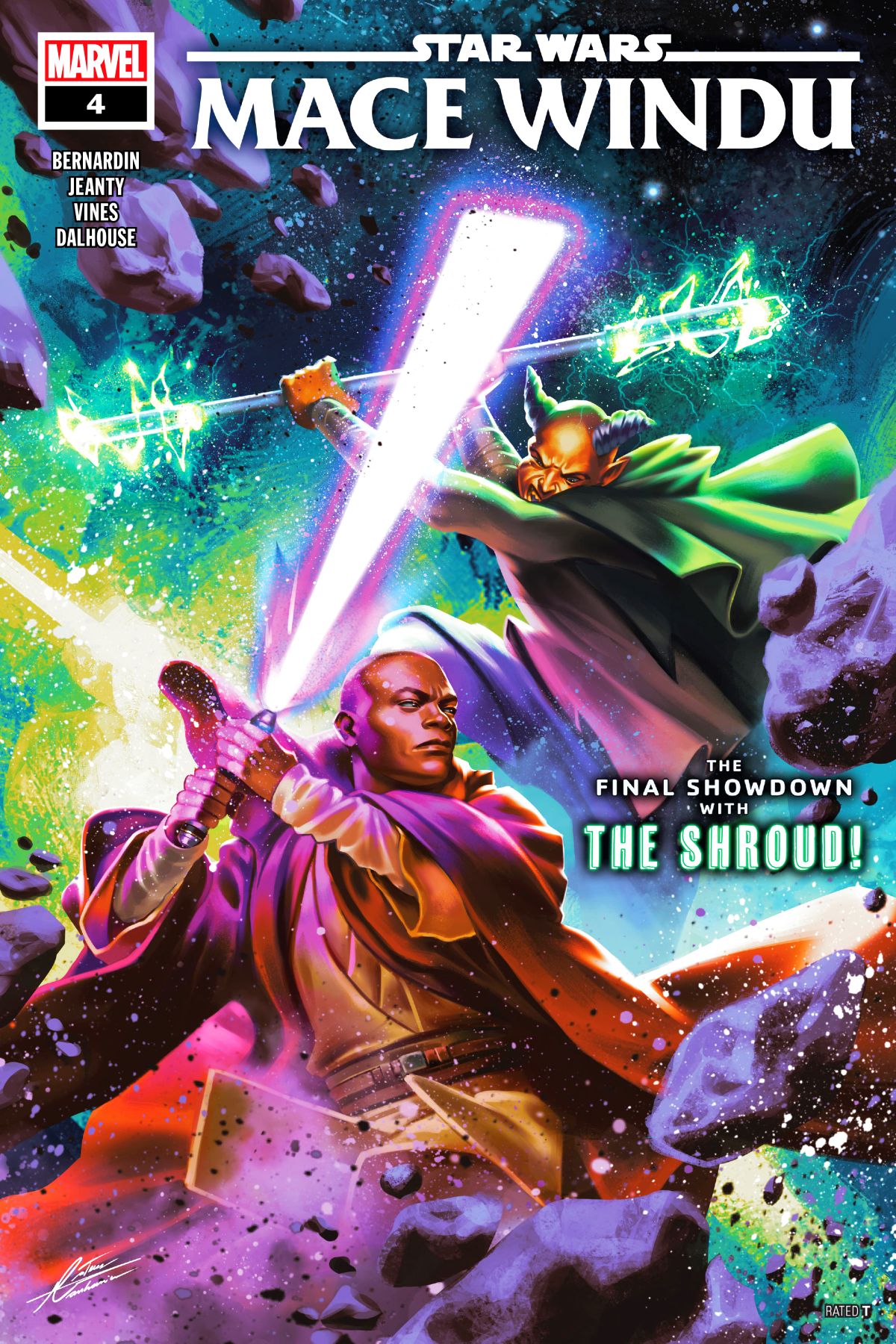 INTRODUCING THE SHROUD! Just as MACE and smuggler AZITA CRUUZ arrive at her freighter, they're beset by MURO, DIYA and the leader of their cult, THE SHROUD. The Shroud is something that Mace Windu was never trained for and isn't prepared for - and might push a JEDI KNIGHT to his breaking point! Rated T