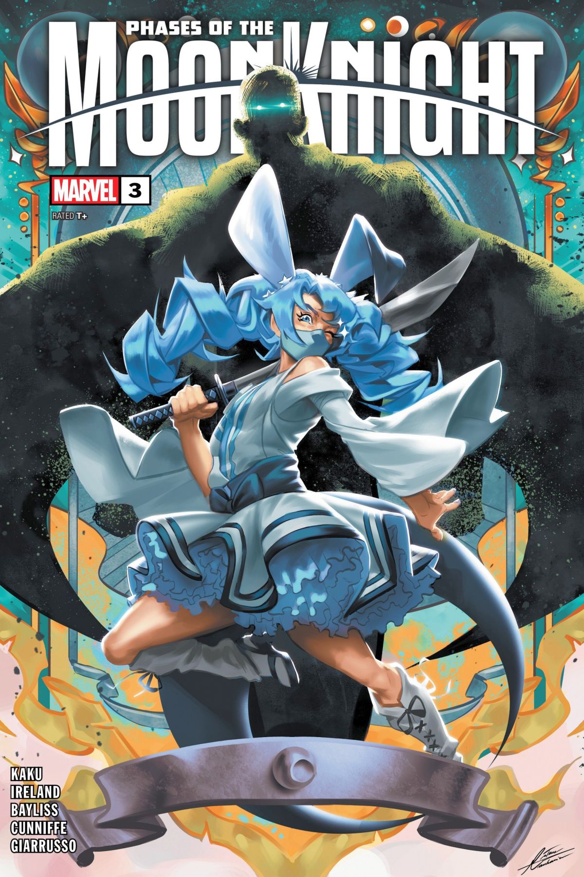 Fall into the next PHASES OF THE MOON KNIGHT alongside New York Times best-selling Author JUSTINA IRELAND as she weaves a tale of an ALL-NEW avatar of Khonshu that might just eclipse every other Fist of Khonshu that came before! Plus! Don't miss the Marvel debut of manga superstar YUJI KAKU (HELL'S PARADISE) as he introduces a brand new Moon Knight with a violent past from a magical future! Rated T+