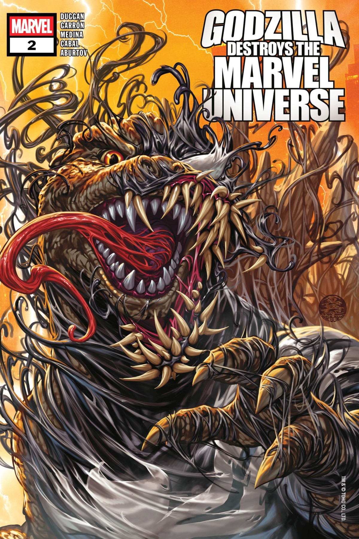 THE LETHAL PROTECTOR BECOMES THE DEADLY DESTRUCTOR AS GODZILLA BONDS WITH A SYMBIOTE! As the KING OF THE MONSTERS sets about making mincemeat out of Manhattan, EARTH'S MIGHTIEST HEROES find reinforcements in the most unlikely of places - the villainous patrons of the BAR WITH NO NAME! Will their combined efforts be enough to slow GODZILLA down - or are they merely adding fuel to the fire as the VENOM SYMBIOTE discovers an even more enticing apex predator to latch onto? Plus, BLACK PANTHER makes a shocking discovery about the nature of VIBRANIUM and what is driving Godzilla's rampage! But will it be enough to make a difference in the wake of the disappearance of MR. FANTASTIC, THE INVISIBLE WOMAN and THE ENTIRE BAXTER BUILDING?! |