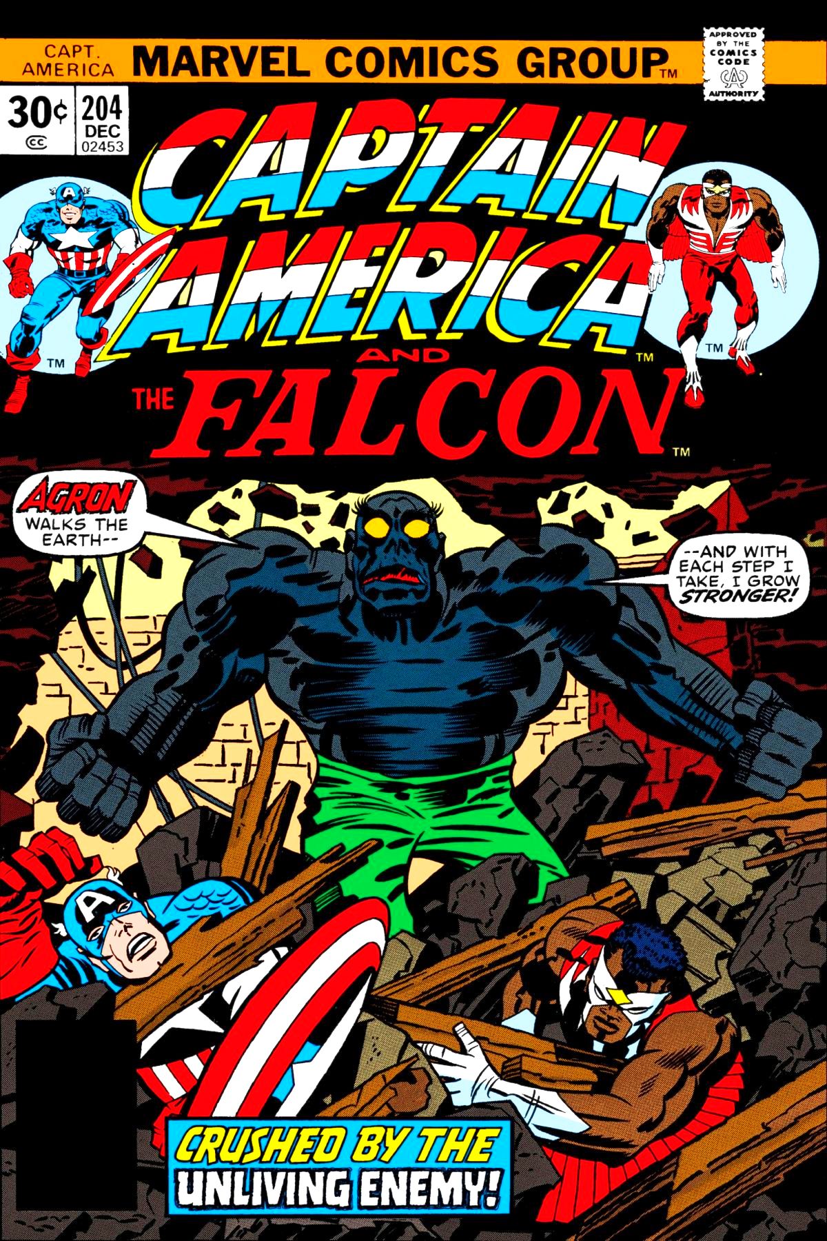 At a SHIELD psychiatric facility, Cap and Dr. Hartman try unsuccessfully to get Brother Wonderful and Brother Inquisitor to reveal how to restore Falcon and Leila's memory. Soon after, Hartman shows Cap a strange inmate: a walking corpse without pulse or heartbeat, calling himself Agron and claiming to be from the far distant future. Later, having grown larger and more powerful, Agron attacks his attendants and breaks out. Meanwhile, Sharon Carter uses the Falcon's condition to try to get Cap to quit his super-heroing and stalks off when he resists. At the psychiatric facility, Agron collapses after being repeatedly shot. Hartman has him taken to the mortuary but fears he is not dead but only resting. He contacts Cap, asking for help but Cap. still smarting from Sharon's comments, begs off. Just then, Agron revives, crackling with energy, and crashes through a wall. Desperate, Hartman frees the still amnesiac Falcon, telling him that Agron is threatening his Brothers and Sisters. Falcon attacks but, as Agron continues to transform before him, screams in horror.