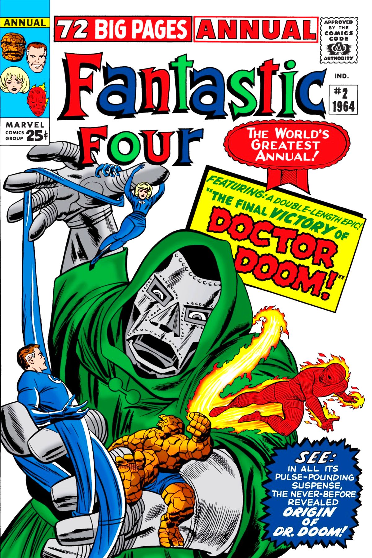 In the lead story, we learn the history of Doctor Doom. His mother was killed when he was but a child, and his father was a gypsy healer. When his father failed to save the life of a Baroness (through no fault of his own) he was killed, leaving Victor an orphan in the care of Boris. Victor then learned his mother was a sorceress, and swore to use all he knew of both science and magic to bring the world under his control. He attended State University, where he met Reed Richards and Ben Grimm. Ignoring Richards' advice to double check his numbers, he tried a dangerous experiment to contact the netherworld, and succeeding only in scarring his facing, driving him to wear a mask and become Doctor Doom. In the second story, Doom has encountered Rama-Tut, which provides him the means to get home and mount a new assault on the F.F. driving a wedge between them in his native Latveria. The issue also has pin-ups of Super Skrull, Rama-Tut, the Molecule Man, the Infant Terrible, Diablo, Alicia Masters and each member of the Fantastic Four. It also contains a reprint of "Fantastic Four #5."