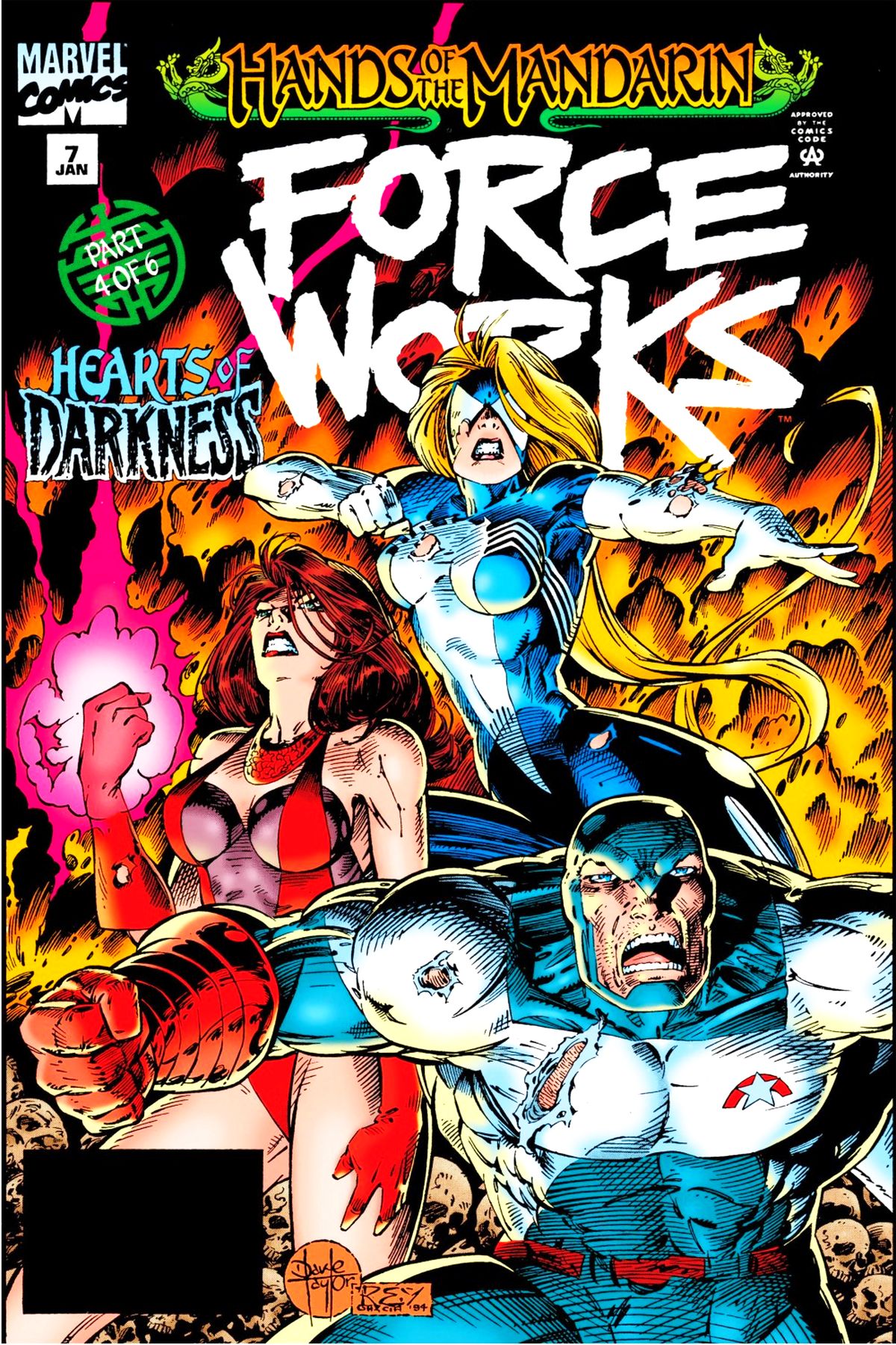 "Heart of Darkness" Part 4 of 6. Guest-starring War Machine. Script by Dan Abnett and Andy Lanning. Pencils by Dave Taylor. Inks by Rey Garcia. Cover by Dave Taylor and Rey Garcia. Story continues from Iron Man 311. With an urgent fury, Force Works attacks the Mandarin's fortress in the middle of nowhere China! The fighting mad U.S. Agent, Scarlet Witch, and Spider-Woman rip into the Avatars during their search for Tony Stark! However they may be too late as the Mandarin is poised to deliver the coup de grâce to his hated foe! But in the nick of time, the Scarlet Witch crashes into the Asian mastermind's chamber room and staggers the super-villain with the ten rings! Setting the stage for the spectacular showdown…Iron Man versus the, wait, hold on, it's not the golden avenger, it's the Scarlet Witch vs. the Mandarin! Wow, is Wanda ready to throw down with the mighty Mandarin? An excellent issue! Story continues in War Machine 10. Appearances by Century, War Machine, Ancestor, Butterfly, Deluge, Foundry, Lich, Q'wake, Old Woman, Sickle, and Warfist. (Note: The stories (and appearances of Force Works) in Marvel Comics Presents 169 thru 172 tie into the Hands of the Mandarin storyline.) 32 pages. Cover price $1.50. |