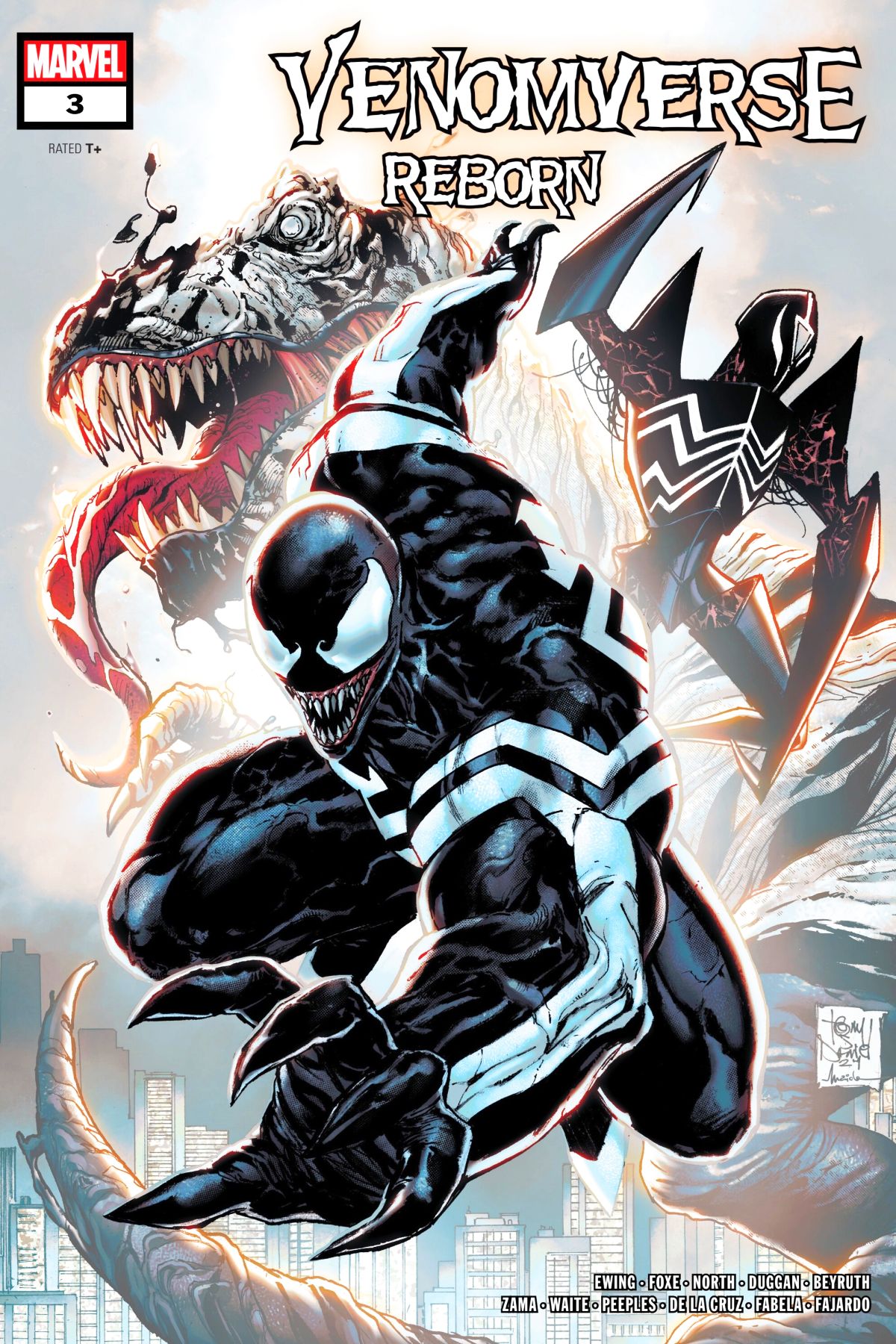 A VENOM FOR EVERY UNIVERSE! Our journey of Venomous beings across the Multiverse continues with darkness, light and everything in between! First up, Gerry Duggan brings us the tragic tale of Venom's biggest fan! Then Ryan North & Matthew Waite bring us a surprising tail of Venom Rex! Next up is the reveal of the all-new symbiote who fights Spider-Verse breakout star, Web-Weaver, from Steve Foxe & Kei Zama! And it's all wrapped up in a special black suit spun by Al Ewing & Danilo S. Beyruth! Rated T+