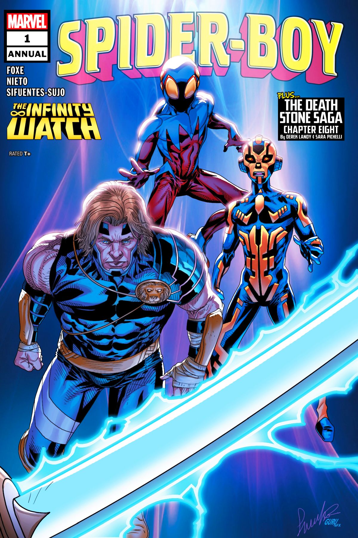 'INFINITY WATCH' PART EIGHT! Spider-Boy is juggling being Spider-Man's sidekick, keeping his friends safe and just being a regular kid. But nothing stops him from jumping in when trouble is brewing! This time he's joined by MULTITUDE, who has the Soul Stone, and PRINCE OF POWER, who has the Power Stone (of course!), as they face off against a mysterious evil they vow to stop! Rated T+