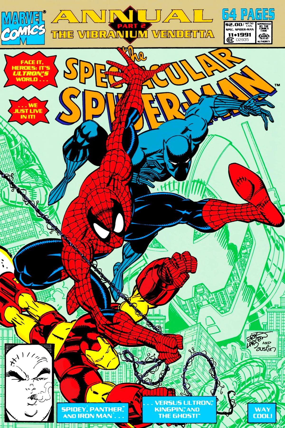 As the Ghost and Ultron-13 fight over Roxxon's artificial vibranium, Spider-Man, Iron Man and the Black Panther try to uncover evidence of the mysterious metal. Silver Sable and the Outlaws storm Broussard's monastery, while the Sandman bides his time. Spider-Man encounters the Rhino in the midst of a bank robbery. Petey Parker babysits young Robbie Baldwin. |