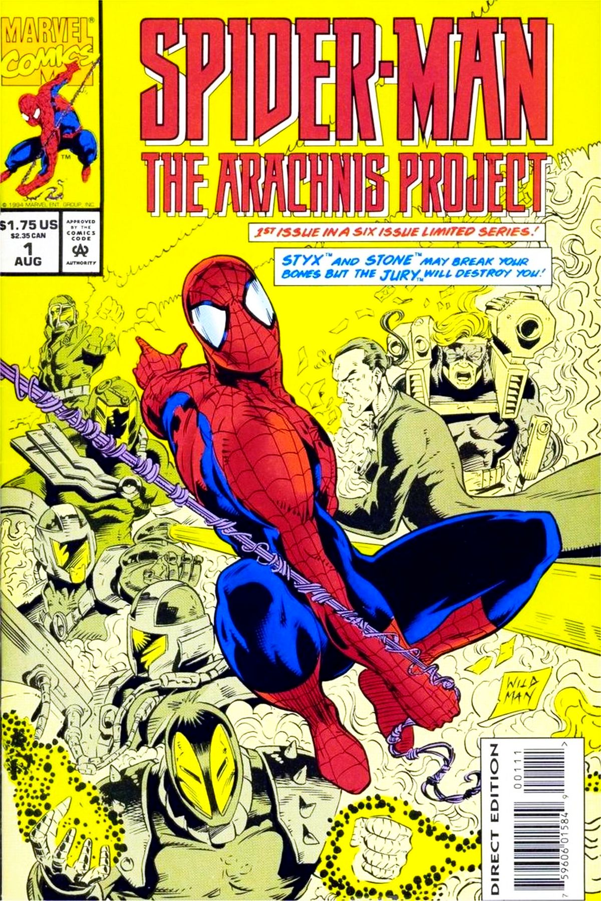 Styx and Stone may break your bones, but the Jury will destroy you! Guest-starring Venom and Warrant. When strange occurrences take place at the Smithsonian Institution, Spider-Man finds himself in the middle of a conspiracy that spans mankind's history. Written by Mike Lackey. Art by Andrew Wildman and Stephen Baskerville. Cover by Andrew Wildman. Cover price $1.75.