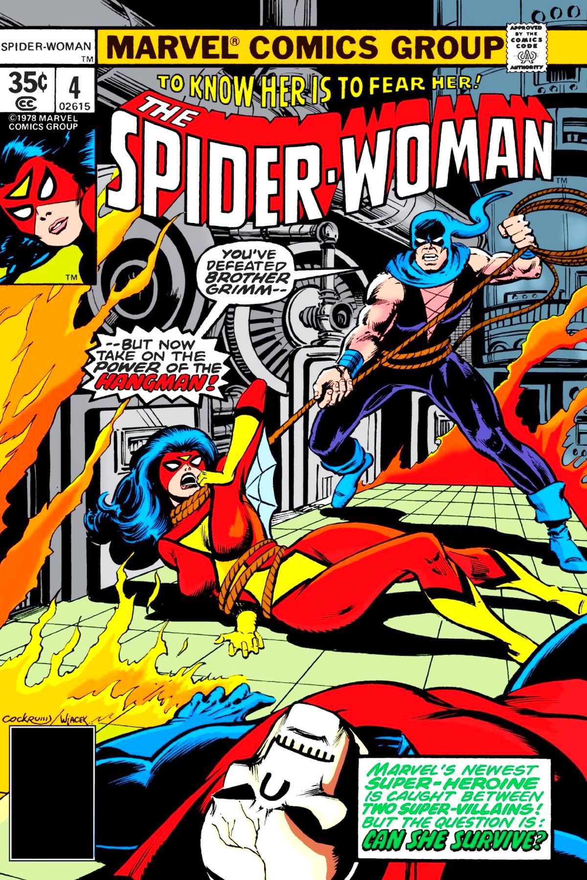 Spider-Woman is pondering her lot in life, when she spots Brother Grimm attacking a car being driven by a diamond dealer. Confronting Brother Grimm, he blasts her off the side of a cliff. When she gets control of her gliding and swoops back up, she finds Grimm and the diamonds gone. The diamonds are given to one of Grimm's thugs, who has him plant them in another man's car, douse the unconscious driver with alcohol and dump him off a cliff. However, before he can complete his task, he's confronted by the Hangman, who is told of the scheme. After learning of the plot, the Hangman hangs the crook, and goes off to find Grimm. The next day, as she is having lunch with Magnus, Priscilla Dolly and her boys, Jessica learns that her father Jonathan briefly boarded in their home, and that William Dolly worked at Pyro-Technics with him. She explains to them that Jonathan is her father, and that he was murdered and she is looking for his killer. When Jessica presses William for more answers, he excuses himself from the table. Changing into her Spider-Woman costume, Jessica decides to go and check out the connection between her father, Pyro-Technics, and Congressman James Wyatt. Wyatt, meanwhile, dismisses his wife and begins making calls to try and eliminate Spider-Woman, while elsewhere Jerry Hunt has arrived in Los Angeles (met by Bill Foster) and has begun asking around to see if people have seen Spider-Woman. As Spider-Woman breaks into the Pyro-Technics building to find more clues, the Hangman attacks one of Brother Grimm's safe houses, and demands that the crooks there tell him everything. Back at Pyro, Jessica accidentally stumbles into a wind tunnel device. She almost gets chopped up in the fan, but thanks to her superhuman strength, she manages to destroy the device. Tracking down William Dolly, she tries to get him to tell her what he knows about Jonathan Drew, but she is attacked by Brother Grimm. During the fight a blaze sparks up, and before Spider-Woman can stop Brother Grimm, she's roped up by the Hangman. The Hangman has decided to "save" Spider-Woman from Brother Grimm, and leaves the villain to perish in the blaze while he drags the hog-tied Spider-Woman out of the complex. As the building explodes, the Hangman tells her that he will keep her safe forever, in his very own dungeon. |