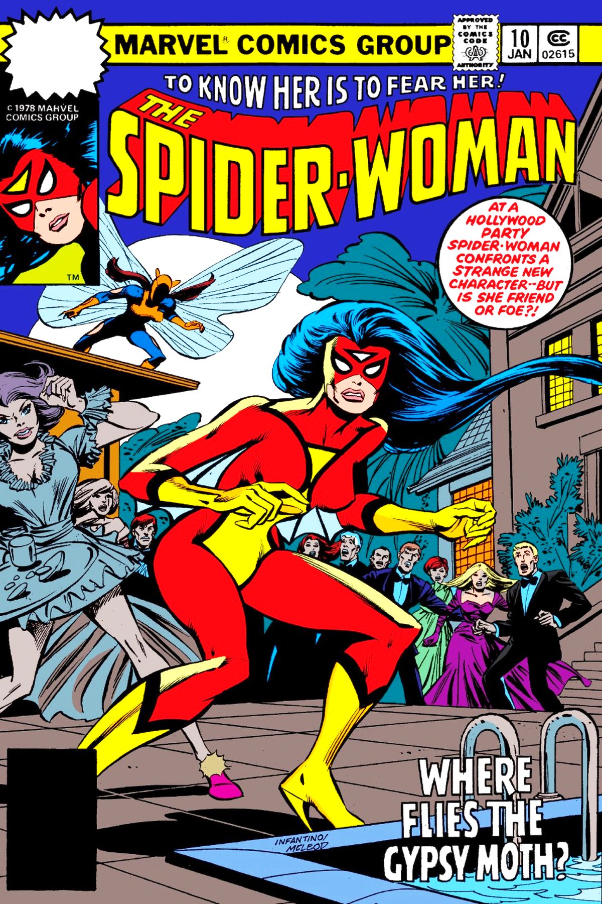 Out on a romantic evening by the beach with Jerry Hunt, Jessica Drew spots a strange woman with wings flying above them. This prompts her to change into Spider-Woman and try to go after the woman. However, the strange moth-like girl gets away. Returning to Jerry, Jerry is very upset that Jessica went chasing yet another "freak", and calls it a night and takes her home. Returning to the boarding house she shares with her friend Magnus, Jessica asks their landlady Priscilla Dolly if she's seen her "uncle" around, Dolly tells her that Magnus got a job as a stage magician. Going up to her room, Jessica finds a new dress purchased for her by Magnus and an invite to an exclusive party that Magnus has been invited to. Going to the party, Jessica finds that Magnus has made himself quite popular very quickly, but finds herself more or less ignored by the party-goers. When Jessica sees the moth-woman again, she is shocked to see that she has some sort of powers that allow her to control thread, as she uses it to turn some of the female party-goers' dresses into cocoons. Not wishing to let this girl get away, Jessica has Magnus turn her party dress into her Spider-Woman costume and chases after her. Engaging the super-powered woman, who reveals herself to be Gypsy Moth, Jessica is attacked by her strange powers. She finds that this woman is not friendly in the least, and is not interested in doing more than fighting. Gypsy Moth uses her powers to make thread from other people's clothing to wrap Spider-Woman up in a thread cocoon and dump her in the pool. However, Jessica breaks free and battles the Gypsy Moth again. Jerry arrives and fires a shot at the Gypsy Moth, hitting one of her wings. Realizing that the wings are part of the Moth's body, Jessica stuns Jerry with a venom blast and takes Gypsy Moth out of there. She decides that to let the Gypsy Moth go, since she didn't really do anything wrong, and isn't interested in making friends, and so Spider-Woman slinks away before the Moth can revive. Later, Jessica is reunited with Jerry, and the two have another argument about what exactly it was that Jessica was doing. |