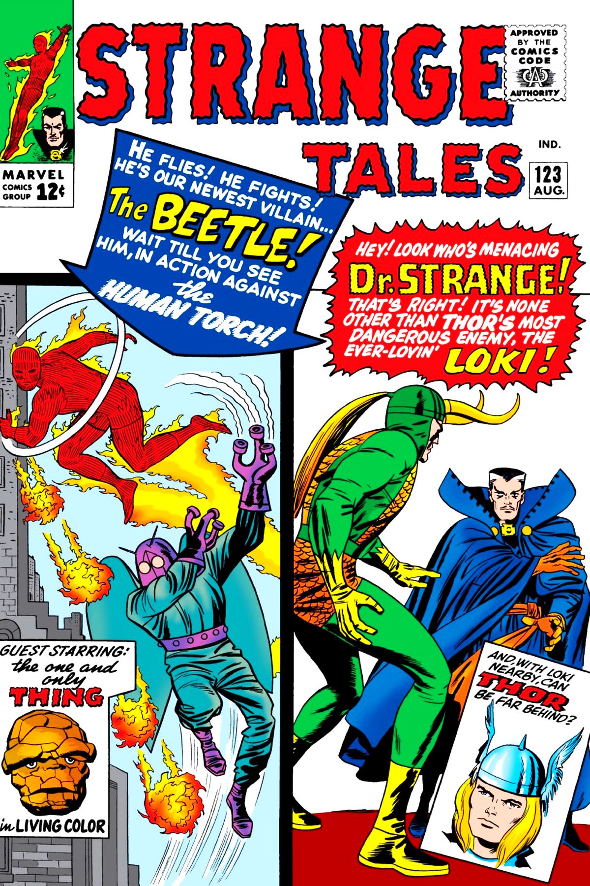 "The Birth of the Beetle" - An old mechanic decides to make a name for himself as the criminal Beetle by creating a suit of armour that endows him with strength, flight, and the ability to burrow rapidly. He uses it to taunt and tease the first superheroes he faces, namely the Human Torch and the Thing, generally by staying out of the Thing's reach, and by throwing everything he stole at the Human Torch, who then has to detour to avoid burning it up. "The Challenge of Loki" - Loki's latest plot against Thor is by manipulating Dr. Strange into believing Thor is evil, and into capturing Thor's hammer. Strange does, but he is not as fooled as Loki thinks, and soon sees through the deception. Strange fights valiantly against Loki, but what chance does any mortal stand against a God? |