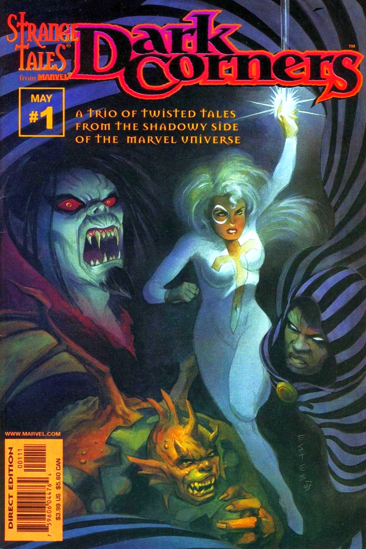 Painted art by John Estes. Cloak And Dagger in "Expressway To Hell," script by Mike Baron, pencils by Alexander Maleev, inks by Chris Ivy; Jason, a runaway teen, hops a freight train and meets a trio of gangbangers also riding the rails; Aided by Cloak and Dagger, Jason and the other runaways are set up at runaway shelters. Spider-Man comic book ad. Morbius in Desiring Martine, script by Don McGregor, art by Mike Dringenberg; Martine Bancroft, having found a new lease on life, works as an editor at 'Enitce' magazine; Outside her office window, Michael Morbius, who was her fiance before he became the Living Vampire, spies on her, torn between remaining in the shadows or revealing his presence to her; While she and her assistant deal with the demands of her publisher who has ordered the revival of a Betty Page-like character, Morbius waits outside reliving his origin. Gargoyle in "In Stone," script by Jean Marc DeMatteis, art by Mark Badger; For months, Isaac Christians, the Gargoyle, has sat like his stone namesake upon the corner of an abandoned rural Virginia church; One lightning-splashed night, he is roused from his stupor by the arrival of Seetah, a goddess-like entity; She transports him to another dimension which she calls the Land, and there, Isaac is attacked by demonic beings. Spider-Man comic book ad. 52 pgs., full color. Cover price $3.99. |