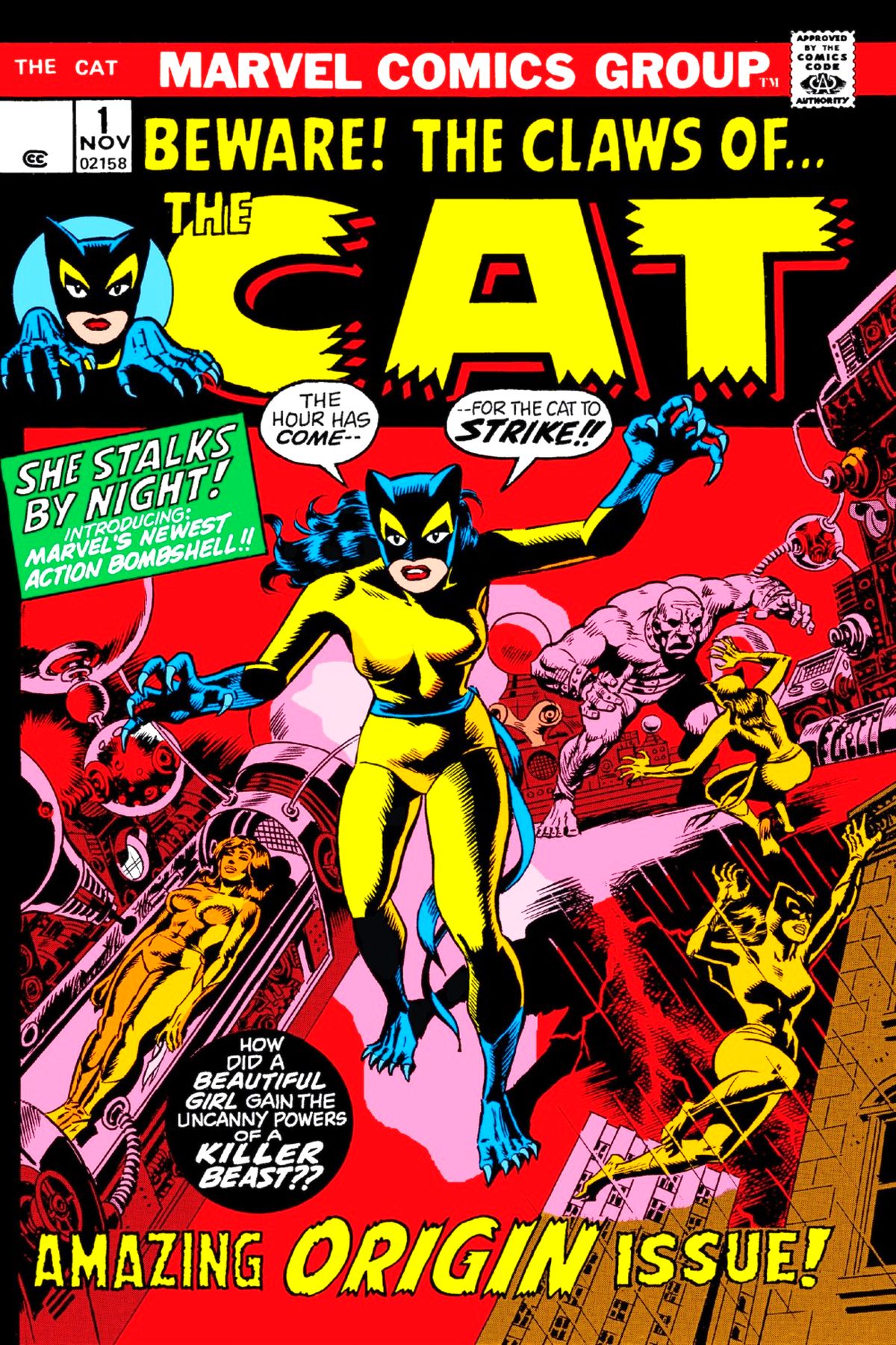 1st app & Origin The Cat who later becomes Tigra. On the splash page, we saw a young brunette woman, dressed in a yellow catsuit and mask, clinging to the side of a Chicago building. She was Greer Nelson, but tonight she became known as the Cat. She was on a mission of vengeance, and to stop a madman. In subsequent pages, we saw flashbacks that revealed how University of Chicago sophomore Greer Grant met rookie policeman Bill Nelson and fell in love, only to be widowed a year later. We also saw flashbacks of Greer's frustrated attempts to find a job, until she met her old physics professor, Dr. Joanne Tumulo. Dr. Tumulo hired Greer for a special project. Her aim was to allow women to achieve their full mental and physical potential. Greer was to be the first subject, until their backer interfered. Malcolm Donalbain, a "world-famous sportsman, eccentric, and entrepreneur," had paid for the doctor's equipment and time and now demanded he provide their first subject. His choice? Shirlee Bryant, a young blonde model in his employ. Greer persuaded Dr. Tumulo to let her undergo the conditioning in secret, rather than cancel the experiment. Greerâs faith in the experiment was not misplaced. All her faculties were improvedâ¦her mental prowessâ¦â¦her physical strength and agilityâ¦her hearingâ¦and something moreâ¦the indefinable sixth senseâ¦intuitionâ¦empathy. Donalbain envisioned himself as the head of an army of amazons. He told Shirlee that she was the prototype and had her don a yellow uniform with clawed blue gloves and boots. When she was given a cat-earred cowl and mask to wear, Shirlee complained that it looked "like a Hallowe'en costume." Donalbain overrode her objections, and told her to adorn her neck with a studded blue collar. Without regard for her own safety, Shirlee followed Donalbain's orders to use her claws to climb a six-story wall and swing by her grappling-hook lines to the other side. She fell to her death. Dr. Tumulo, who had gone to Donalbain's headquarters to call off the experiment, witnessed Shirlee's demise. She was outraged when Donalbain callously dismissed Shirlee as an "incompetent fool" and vowed to create as many more prototypes as he needed. She fled, taking one of the Cat uniforms. She showed it to Greer and described Shirlee's fate. Donalbain had his henchmen go to her lab and set off an explosion, hoping to eliminate the doctor and all traces of the experiment. Greer returned to find her critically-wounded mentor amongst the rubble. She took the Cat uniform and swore to avenge Shirlee and the doctor. Due to her enhanced abilities, she adapted quickly to the strange apparatus (and brought us back to the present). The Cat immediately ran into Donalbain's henchmen when she broke into his headquarters. She defeated them, but fell victim to a soporific gas while searching for Donalbain. When she awakened, she found they had bound her hands behind her back. When Donalbain arrived, he recognized Greer. He told her that he was opening a nationwide chain of health emporiums and he needed "specialists" to operate them -- women with the same powers she had gained. He showed her a duplicate of Dr. Tumulo's equipment that he had constructed based on Shirlee's notes. Using the machines, he would build a force of perfect physical specimens. Each woman he transformed would be given an accessory like Shirlee's, which he called a Will Nullifier, which would place them under his control. He ordered one of the collars be placed around Greer's neck, but she mananged to dodge his henchman and, using a shoulder charge, knock him into Donalbain. Donalbain suffered from severe haptephobia (the fear of being touched) and ordered the bumbler punished. In the confusion, the Cat escaped. She returned to sabotage Donalbain's machine, but was discovered. She'd done enough damage to short out the electrical service to the building. In the dark, her enhanced night vision gave her the advantage, even though Donalbain and his men were armed. Rather than let the Cat rake him with her claws, Donalbain turned his pistol on himself. The Cat escaped as the building burst into flames, wondering "have I misused my powers? Have I become a stronger woman only to become a poorer human being?" |