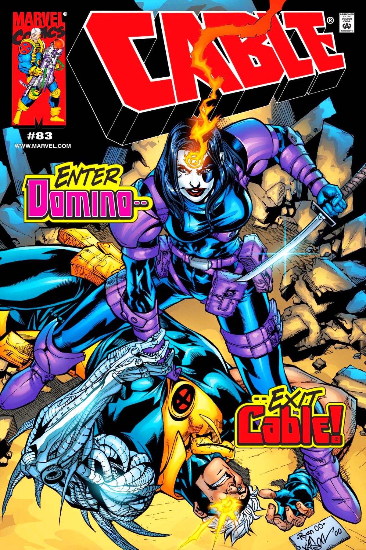 Cable battles Domino to keep her from killing Shire and ends up changing the future so that the civilizations of Harmony and the Ranshi never existed. |