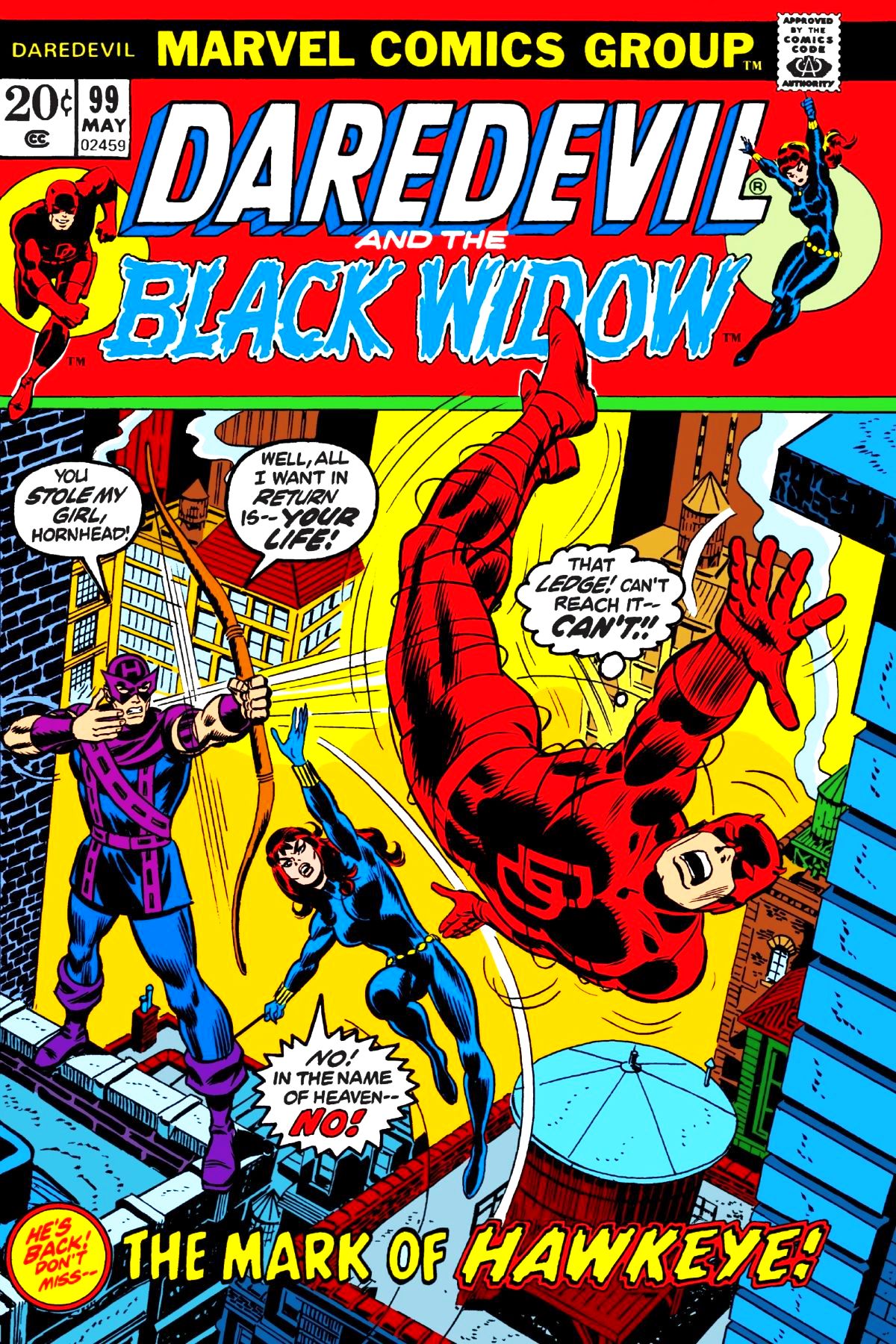 Hawkeye arrives in San Fransisco, to "take back" the Black Widow from Daredevil. Deep down, the two know it's ultimately her choice, but that doesn't stop their mutual jealousy from drawing them into a couple of battles. They are forced to set their differences aside, however, when the Avengers come calling for help. To be continued in "Avengers, Vol. 1 #111." |
