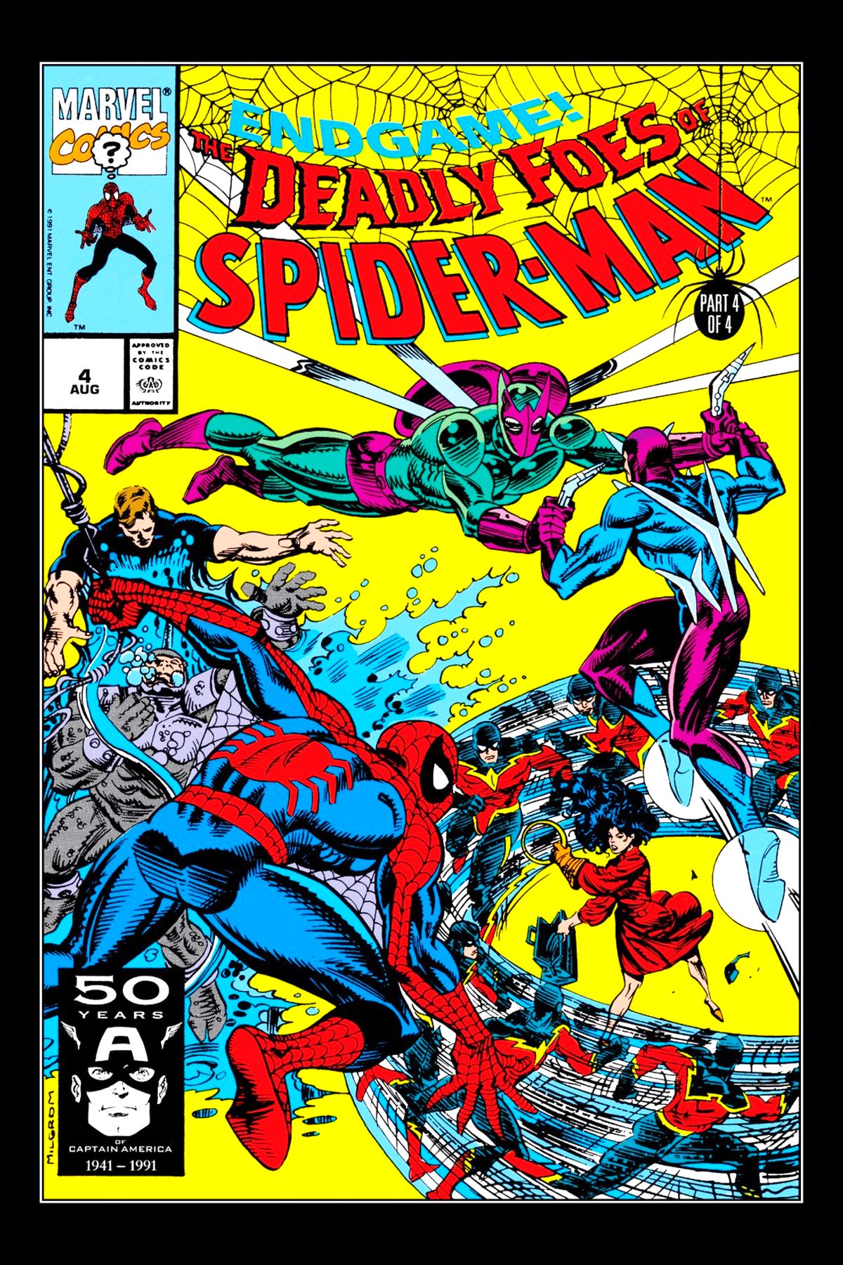 "While the City Screams!" Part 4 of 4. Script by Danny Fingeroth. Pencils Al Milgrom. Inks by Al Milgrom, Mike Machlan, and Harry Candelario. Cover by Al Milgrom. In Midtown Manhattan the warring factions of the Sinister Syndicate battle for super-villain supremacy! The Beetle, Speed Demon, and Hydro-Man vs. Boomerang, Leila, and the Rhino! And of course the wondrous wall-crawler is caught in the middle; and the Kingpin of Crime is pulling all the strings! With a divide and conquer strategy, can the Amazing Spider-Man shut down the syndicate? It's past time to put 'em out of business! Cameo appearances by Pembroke and Justin Hammer. (Notes: Elements of this four-part story lead into the Lethal Foes of Spider-Man (1993) Limited Series and later on into various story lines in the Thunderbolts (1997) series. 32 pages. Cover price $1.00.