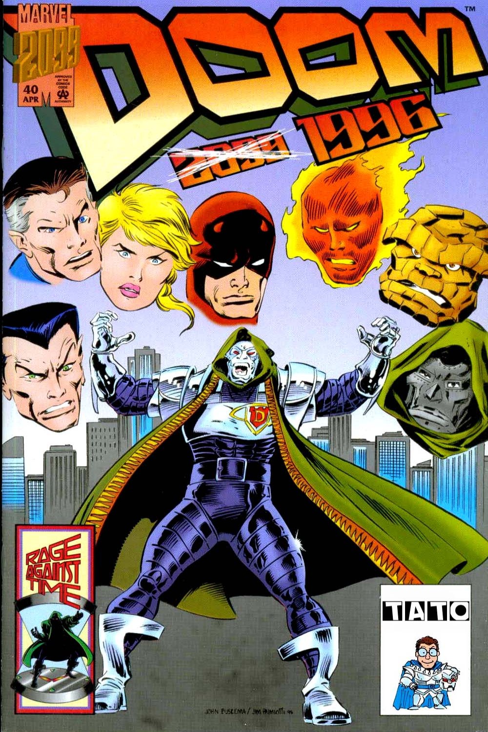 Rage Against Time: Part 1 of 4: Visitation - Written by Tom Peyer. Art by John Buscema & Scott Koblish. Cover by John Buscema & Jimmy Palmiotti. Doom travels to the modern day Marvel Universe! Doom's plan to save Latveria leads him to 1996 -- face first with a ton of Marvel characters -- and smack into the Fantastic Four headquarters! Daredevil, Doctor Doom, Doctor Strange, Sub-Mariner appearances. 32 pages, full color. Cover price $1.95. |
