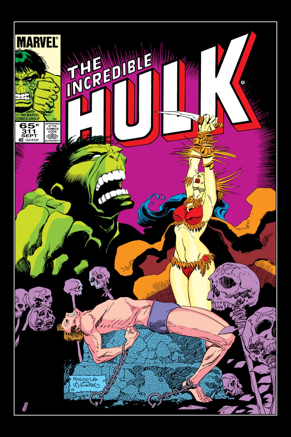 Bruce Banner finds himself about to be sacrificed on an alter by the very orange-skinned woman he tried to rescue as the Hulk. Bruce is confused as his last memories were of how Nightmare made the Hulk go savage in the hopes of slaying his foe Doctor Strange. This battle ended with Banner committing psychic suicide as he no longer wished to live a shared existence with the Hulk. Accepting his impending death, Banner closes his eyes and prepares for the end. Suddenly, the sacrifice is stopped by Dr. Daniel DeCyst, the man who is in charge of the skeletal warriors. Ordering the savage woman to stand down, DeCyst is delighted to see another human on this world and frees Banner. DeCyst reveals that he was formally from the University of Edinburgh circa 1759. As they leave, the savage woman snaps out of whatever control the Doctor had over her. Horrified that she almost killed someone, she vows to get revenge against the man who has slaughtered so many of her people. Meanwhile, Bruce is taken to DeCyst's lab where he reveals to Banner that he is an alchemist. Banner learns that DeCyst has been trying to find the key to immortality, the exact opposite of what Banner wishes to achieve. DeCycst explains that his theories and experiments got him expelled from the University of Edinburgh. With no other support in his time, the doctor continued his study in seclusion. Using a spell, he accidentally cast himself to this alien world of orange skinned savages. It is here that he forged his empire and continued his studies. He then reveals that to maintain his life, he drank the blood of the savages. Daniel DeCyst then takes Banner up to another room where a number of the native of this world are strung up from the ceiling and are being slowly exsanguinated. Banner finds this mad, but when he tries to attack DeCyst, the elderly alchemist pulls a flintlock pistol. Banner then flees, back outside and tries to get away. While DeCyst is distracted, the savage woman who would have been sacrificed manages to get up behind him and stab him through the heart. With danger all around, Bruce wills himself to transform into the Hulk who is joined by the Triad. As the Hulk battles DeCyst's demonic hordes, the Triad fear that he will fall in battle. In order to make the Hulk see reason, Guardian fires an arrow into the Hulk's brow. This makes the Hulk realise that the woman he came to save doesn't need his help anymore. The Hulk then triggers the failsafe spell that transports him and the Triad back to the Crossroads.