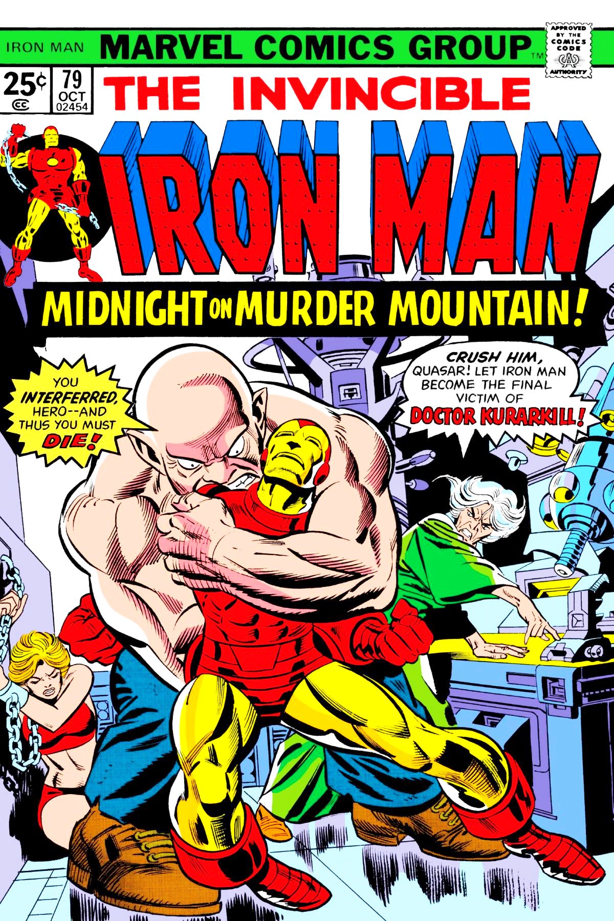 In another fill in issue, Iron Man sees a young couple stranded in a rainstorm by a downed tree. Bringing them to the closest town under the guise of Tony Stark, the three check into a hotel to wait out the storm. Tony is awakened in the middle of the night by a scream, only to find that he has been locked in his room. Changing to Iron Man, and not wanting people to know Iron Man was in his room by breaking down the door from the inside, he instead decides to break out through the metal-shielded window from the inside. He follows the sound of screaming to the basement, where he meets Dr. Kurakill and her assistant, Quasar the Future Man. Kurakill has been devolving humans, and giving their power to the ape she evolved into Quasar. With the help of the young couple's cat (who may, in fact, be a devolved human victim of Dr. Kurakill herself) Iron Man breaks free, knocks Quasar unconscious, and shuts down Kurakill's equipment. Kurakill unleashes her army of devolved human apes, hoping they will overwhelm Iron Man, only to be attacked by them herself. Iron Man swears to devote the full resources at his disposal to the curing of the devolved humans, and the moral education of Quasar. |