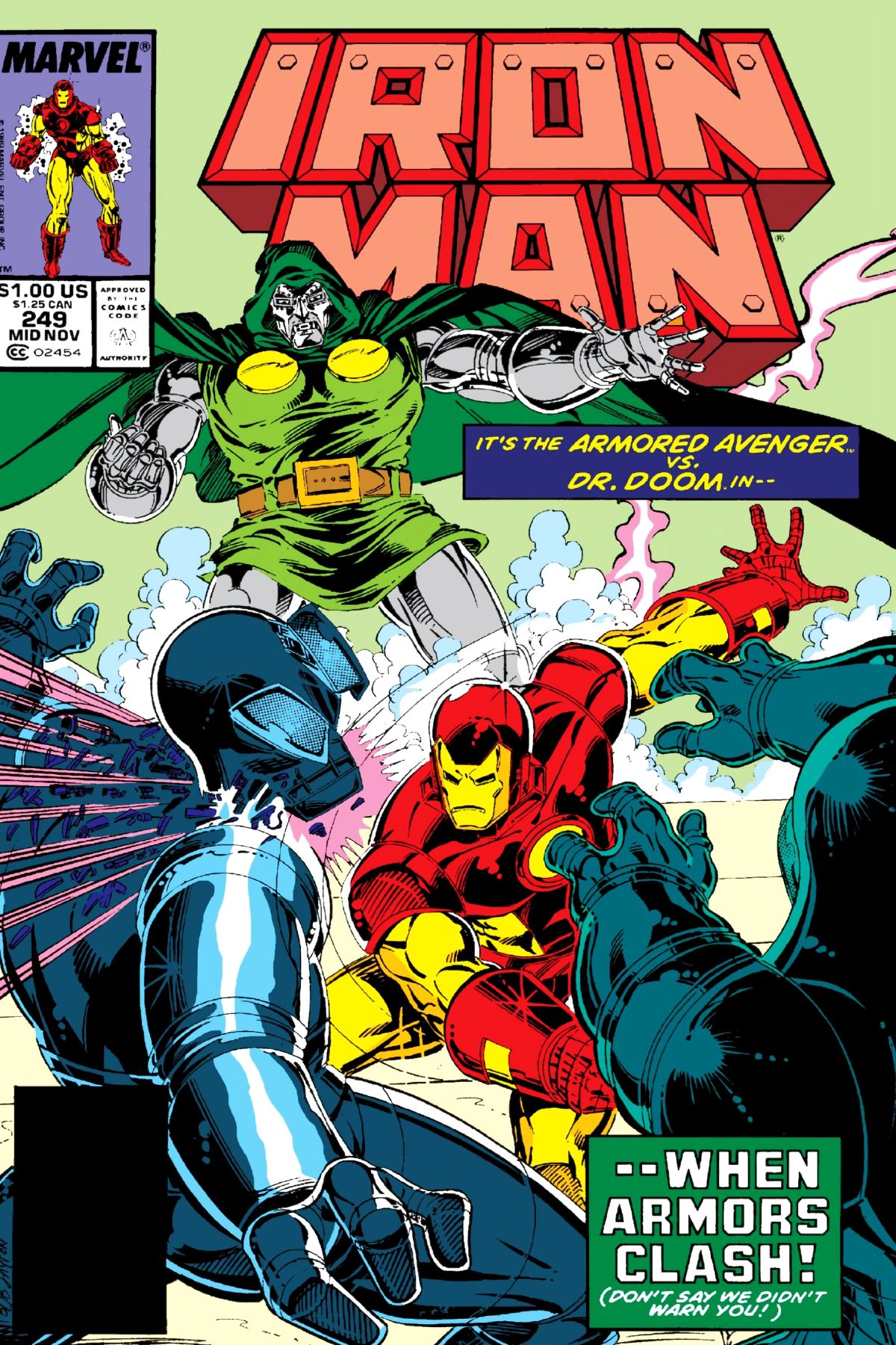 An object of unknown origin appears in front of Doom in his chambers, and he takes it for study. It is incredibly old and of mystical origin, but little else is known about it. He soon learns that a similar object appeared before Iron Man. When Tony refuses to sell it, he tries to take it by force. The two objects couple together, and when the two armored warriors get close to them, they are both engulfed in some sort of black light. |