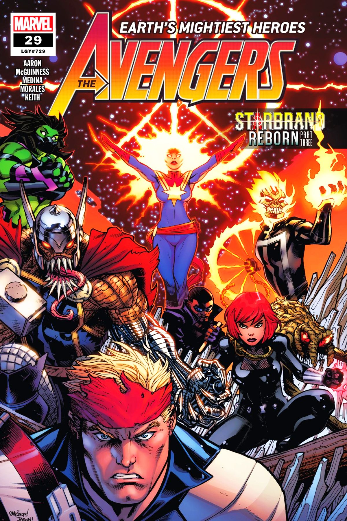 STARBRAND REBORN Part Three: THE RISE OF THE WAR WIDOW The battle for the Starbrand heats up like a supernova, as Captain Marvel goes toe to toe with Firelord, Ghost Rider races the Silver Surfer and Brood Thor... tries to eat the Avengers. Meanwhile the Black Widow kicks much butt in outer space with a bold new weapon in her arsenal. That's right, the Black Widow + the War Machine armor = the all-new, all-deadly War Widow. Rated T+ |