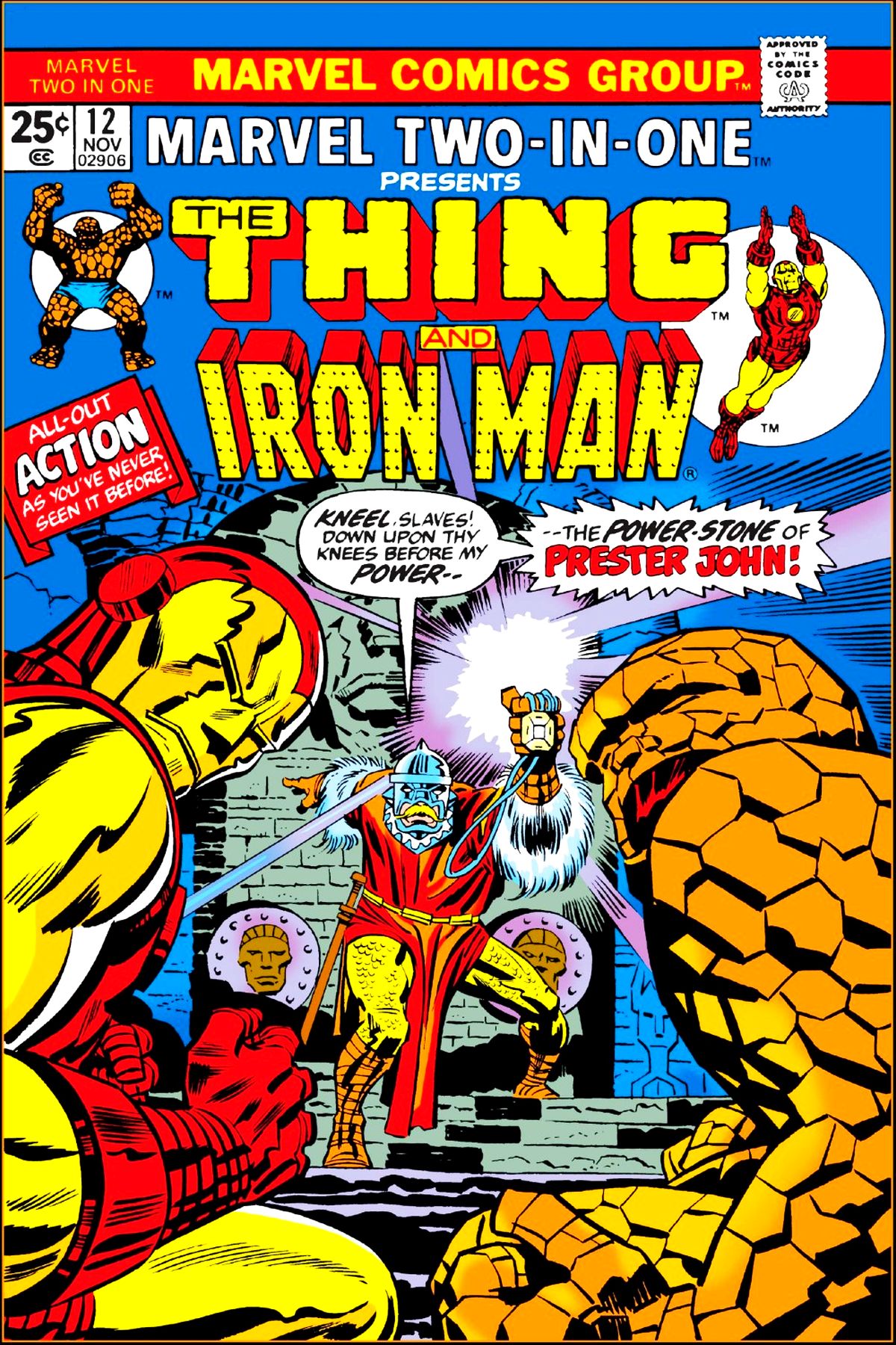 The Thing has been recruited by Tony Stark to test a new space vessel, but the test fails when the bedrock proves itself less than strong enough to support the launch. The Thing encounters Prestor John, last seen in Fantastic Four #54, and he and Iron Man have to find a way to stop his quest for power. |