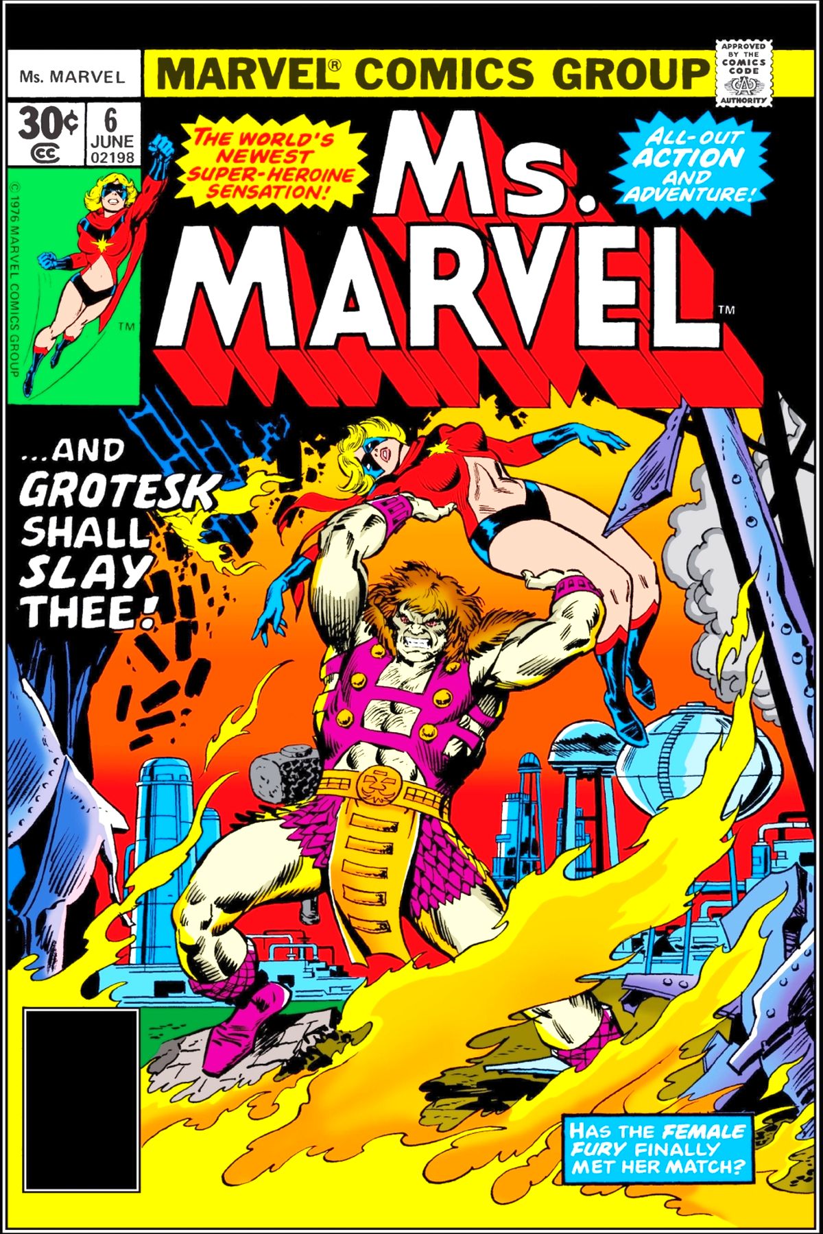 When the first issue of Woman Magazine turns out to be a financial success thanks in part to an article about Ms. Marvel, J. Jonah Jameson is both furious and happy about the outcome of its first issue. When he goes to tell off/congratulate Carol Danvers, she passes out from visions brought to her by her powers as Ms. Marvel. Later, Carol changes into Ms. Marvel and is drawn to a factory where the underground dweller known as Grotesk has come to the surface to claim a Cavorite crystal. Ms. Marvel tries to stop Grotesk. However, she is easily overpowered and is lost in the burning rubble of the factory. Grotesk appears from the wreckage to those spectating the battle to boast about the destruction of Ms. Marvel. |