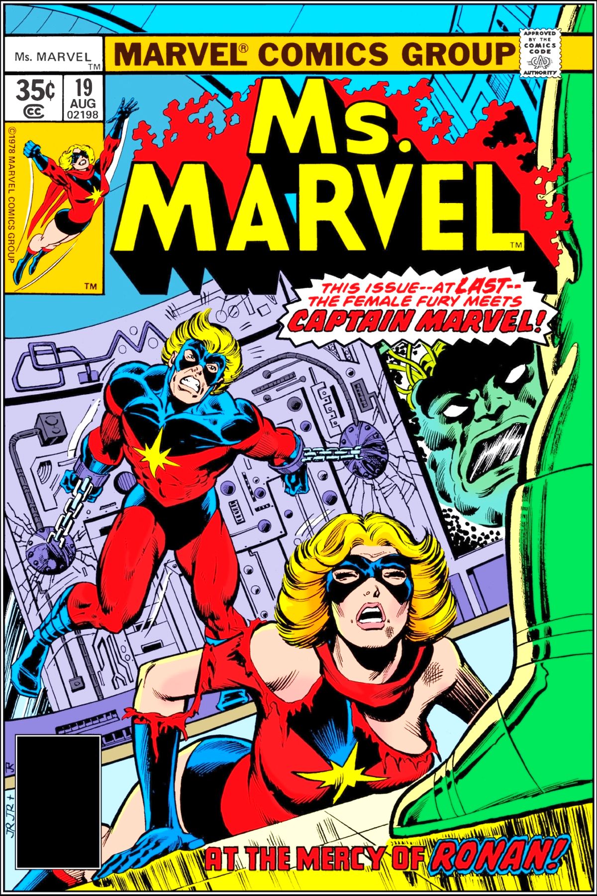 Ronan the Accuser arrives in Texas to eliminate a number of Kree that have fled to Earth to find new lives. He then travels to New York where he locates and attacks Carol Danvers. Changing into Ms. Marvel, she proves to be no match for the Kree soldier. When Captain Marvel arrives and is shocked to find that Carol is wearing a uniform similar to his, it gives Ronan the opportunity to knock both of them out and take them aboard his ship. There, under the supervision of the Supreme Intelligence, Ronan probes Carol's mind to learn of her past, and the events that led to her becoming Ms. Marvel. After the probe is done, both she and Mar-Vell break free and take down Ronan, then make their escape from the ship. Afterwords, the two reconcile and agree to be friends before parting company. |