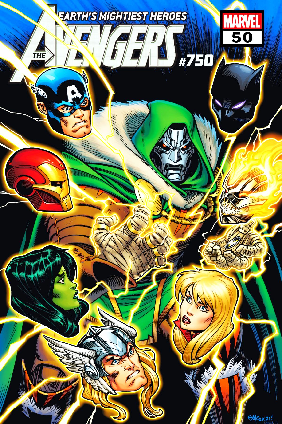 COMMEMORATING LEGACY #750! Supersize extravaganza of Earth's mightiest action and surprises! Witness the jaw-dropping conclusion of "World War She-Hulk!" Learn the true purpose of the prehistoric Avengers! Uncover the shocking secret of the Iron Inquisitor! Behold the most powerful collection of super-psychopaths that any Earth has ever seen! Watch the Avengers recruit some shocking new members! And follow the Ghost Rider on a quest for vengeance across the Multiverse that will spark an all-new era in Avengers history! Plus: A bonus story featuring Thor by Christopher Ruocchio and Steve McNiven! RATED T+ |