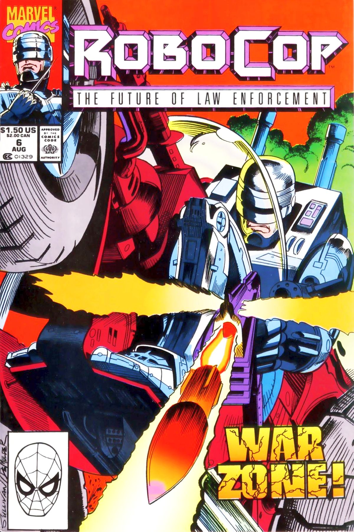 Cover by Lee Sullivan and Kim DeMulder. War Crimes!, script by Alan Grant, art by Lee Sullivan and Kim DeMulder; RoboCop reaches the Desert Hawk but is persuaded to see his side of the war as a leader trying to save his people from famine; Convinced of Desert Hawks noble intentions, RoboCop leaves to intercept an advancing Spanish military force on Desert Hawks fortress; After a brief battle with this small army and an unexpected ED-209 unit also being tested for warfare, RoboCop contacts the Old Man via Satellite Uplink; The war started because Desert Hawk was sending his people to Spain to survive the famine they were experiencing; Robocop shares how Desert Hawk had found a viable means of underground irrigation that would save his people but would take time to be fully realized. 36 pgs., full color. $1.50. Cover price $1.50. |