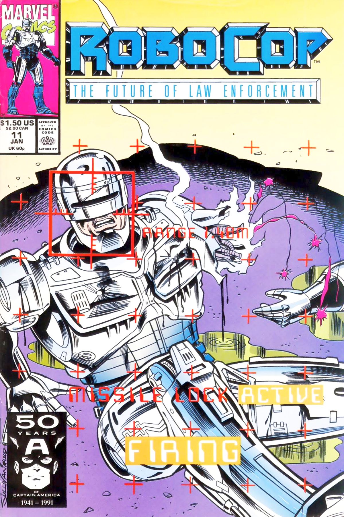 Cover by Lee Sullivan and Bob McLeod. Unfinished Business, script by Stephen Rupinski and Evan Skolnick, art by Alex Trimpe and Herb Trimpe; A deceased ex-employee of OCP named Daniel OHara is brought back to life through an experimental concept called engraming; By surviving death and the conservation of captured brain wave patterns he is reborn in the machine built by unsuspecting privately licensed scientists and called Cyberwraith; Through flashbacks, he learns that RoboCop had killed OHara then seeks revenge. 36 pgs., full color. $1.50. Cover price $1.50.