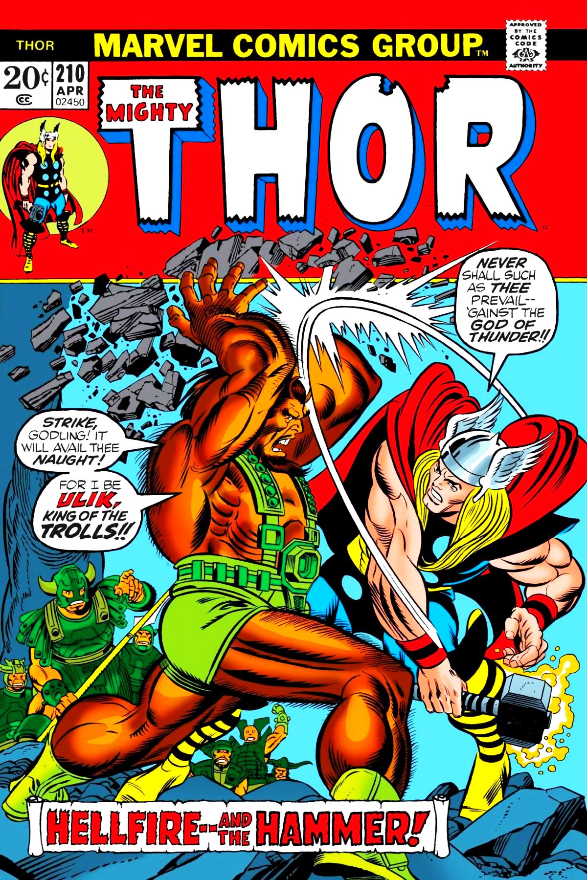In the caves of Geirrodur, he and Ulik look on with anger at Thor, who is in Korea. Thor finds a deserted cliff and falls asleep. While so, Trolls steal him back to their caverns, but before they get very far, Thor wakes up. But before he can do anything, Ulik strikes. During the battle, other Trolls bring up a large chunk of magnetized Uru ore, which pulls Mjolnir free from Thor, and holds it tight while the Trolls carry it off. Thor races after them, but before his eyes, they hurl it all into the flaming foundry. But before he changes back to Blake, Thor lunges into the foundry after it. |