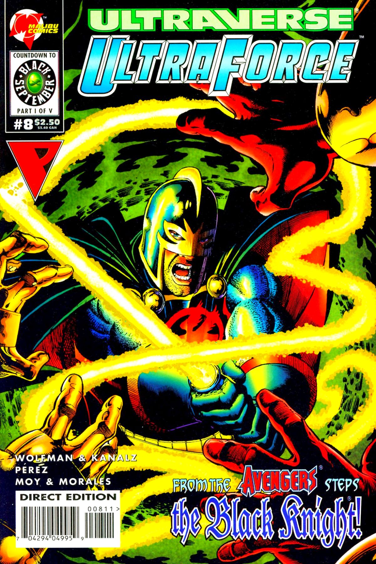 Q: Where has Marvel's Black Knight been hiding? A: In Malibu's Ultraverse! Fans of Marvel's Avengers know that the Black Knight has been missing since Avengers #375. Ultraforce #8 reveals exactly where he's been hiding and sets up key story events for later in 1995. Plus: Siren, the Ultraverse ultimate new bad girl, blackmails her way into UltraForce, forcing teammates Prime, Hardcase and Prototype to rethink their organization. |