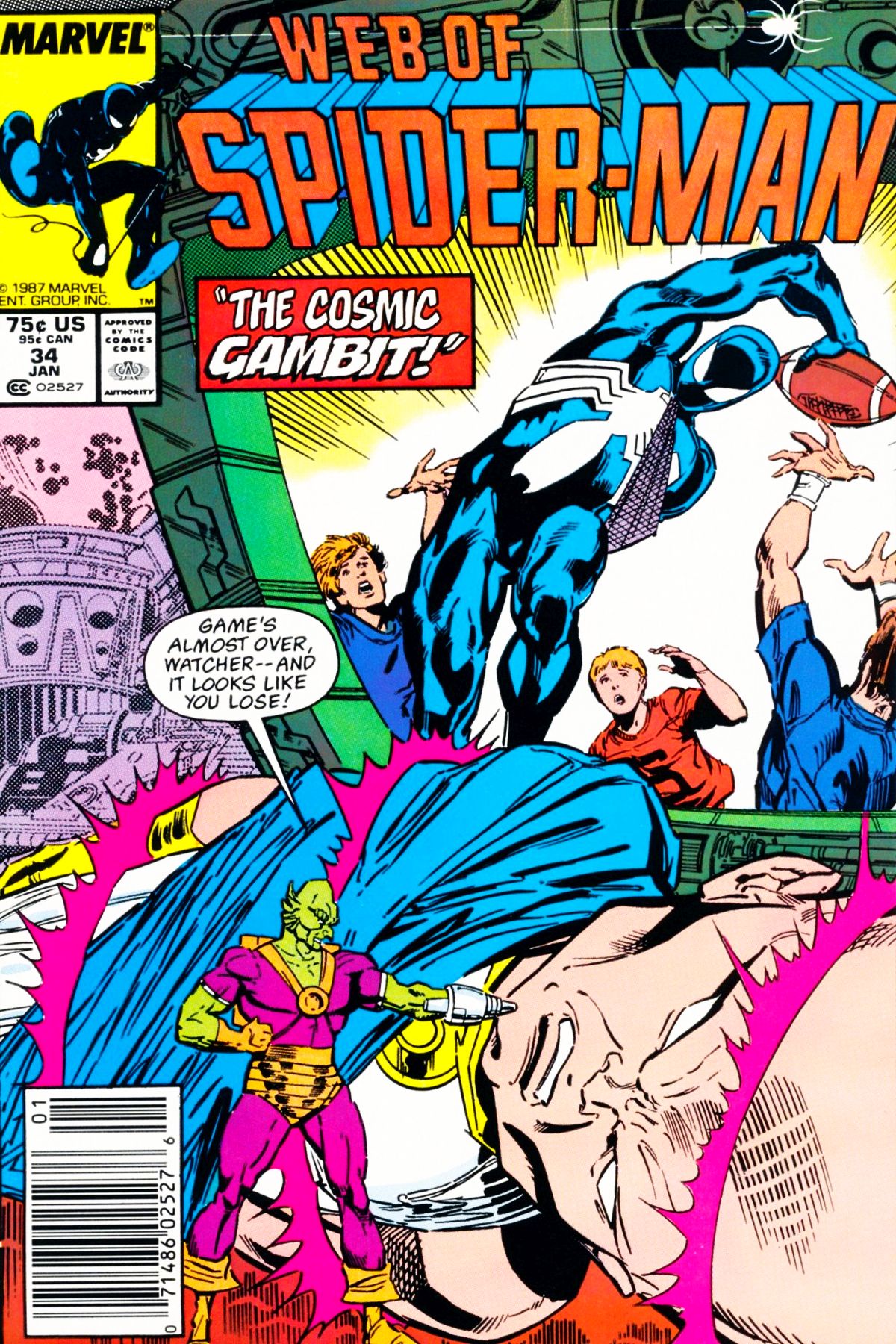 An alien named A'sai invades the home of Uatu, the Watcher, on the moon, using a weapon of profound power to incapacitate the cosmic being. Eventually, they settle on a wager: the Watcher's many devices against the mysterious weapon A'sai has found, and the contest is a pickup football game on Earth. Spider-Man does not realize it, but the outcome of his contest may decide the fate of worlds! |
