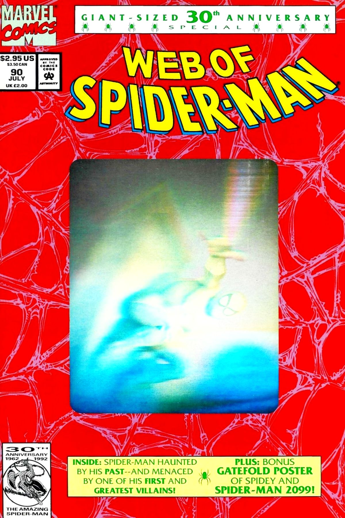 A special double-sized issue honoring Spider-Man's 30th Anniversary, featuring a 3-page gatefold poster and a 4" x 5" hologram cover. And, oh yes, there's a story as well, as Spidey once again faces Mysterio, the man who uses movie special effects for crime! Polybagged with no Hologram on cover. |